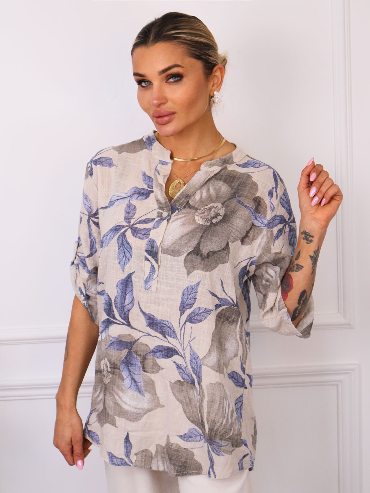 KOSZULA WZORZYSTA Z LNEM- BEŻOWA