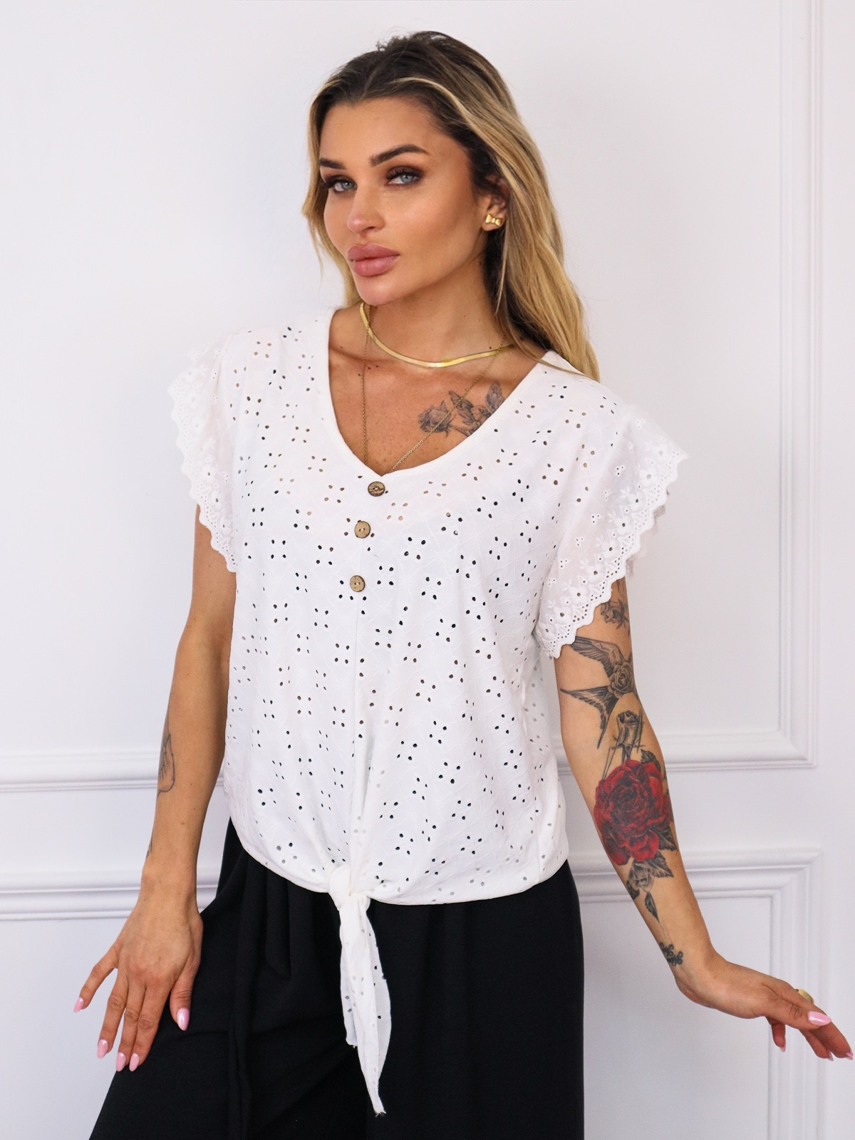 BLUZKA AŻUROWA Z WIĄZANIEM I GUZIKAMI- BIAŁA