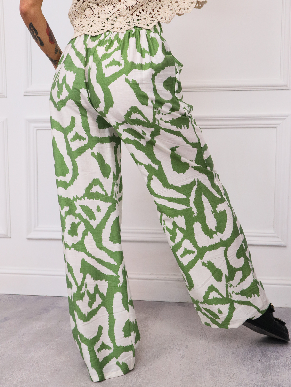 SPODNIE WZORZYSTE Z GUMĄ I WIĄZANIEM W PASIE- ZIELONE