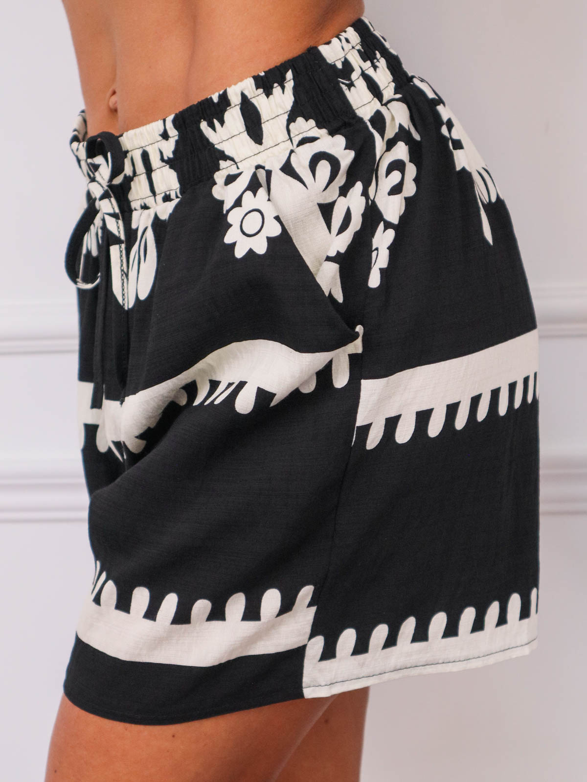 SZORTY WZORZYSTE Z WIĄZANIEM W PASIE- CZARNE