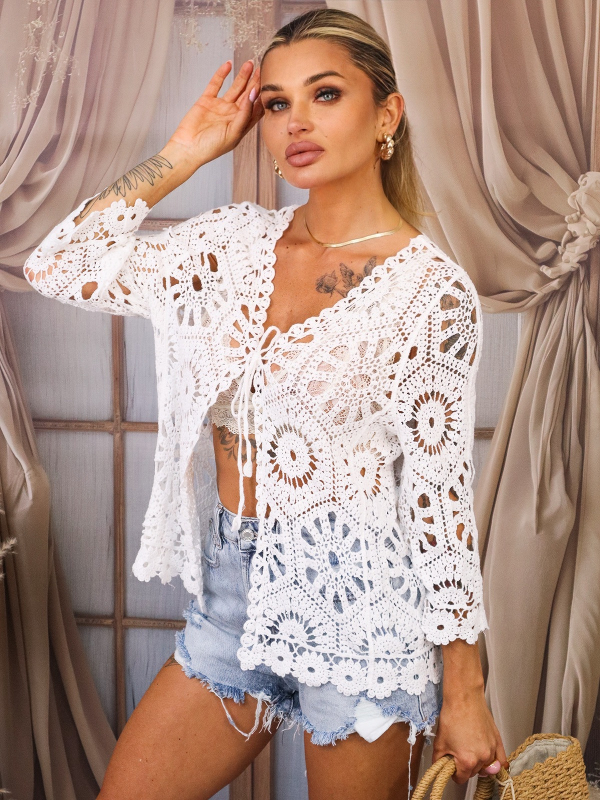 NARZUTA AŻUROWA KARDIGAN Z WIĄZANIEM- BIAŁA