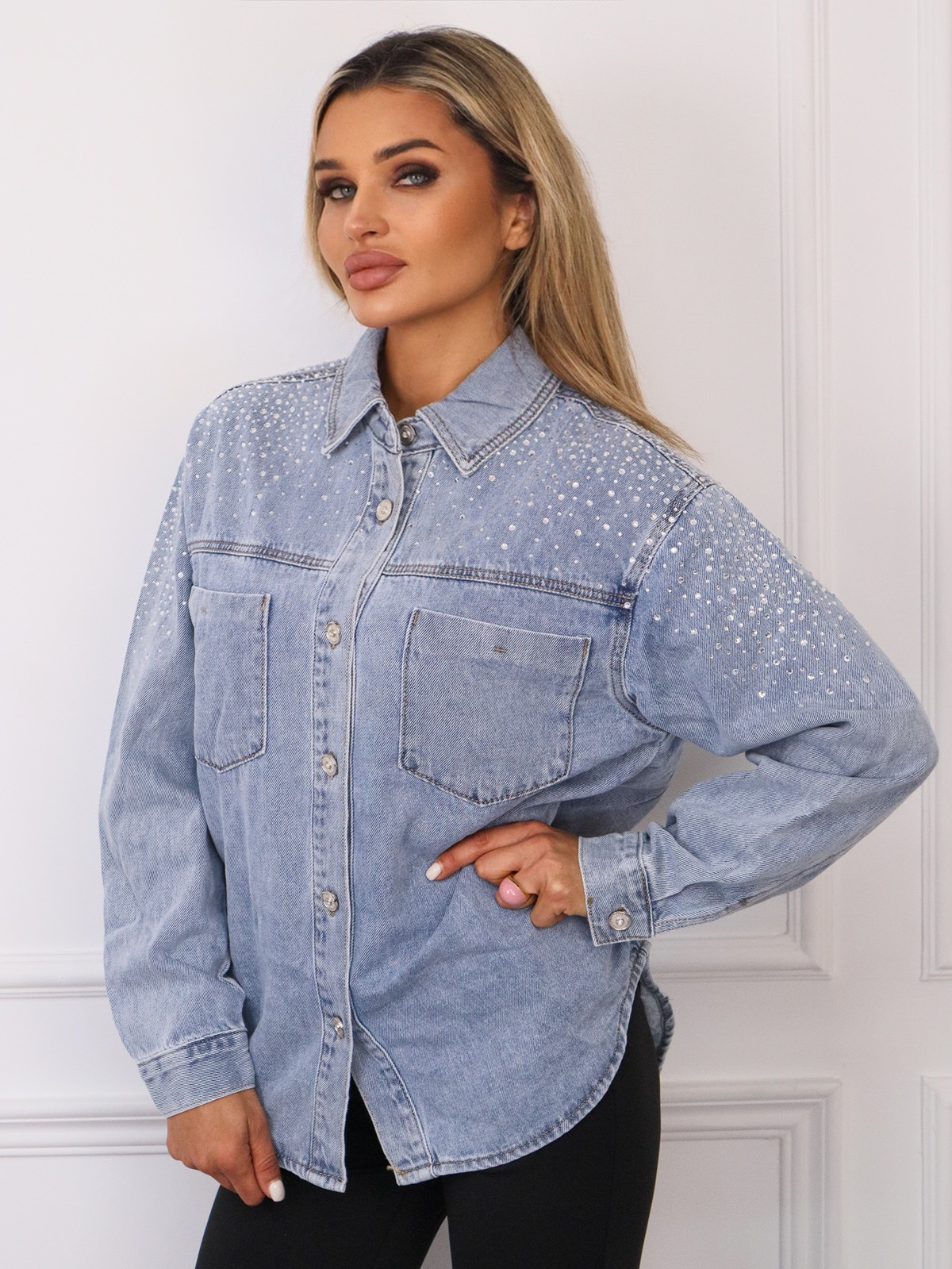 KOSZULA JENASOWA Z CYRKONIAMI NA RAMIENIU I RĘKAWIE- NIEBIESKA