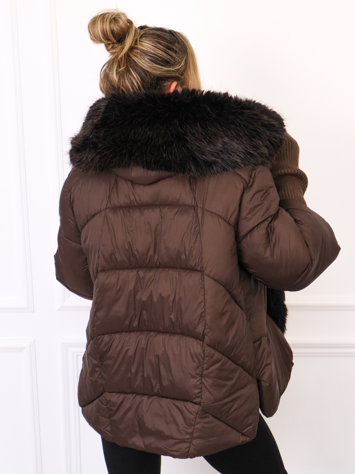KURTKA PUCHOWA Z FUTREM I DŁUGIMI ŚCIĄGACZAMI NA RĘKAWACH- CZEKOLADOWA