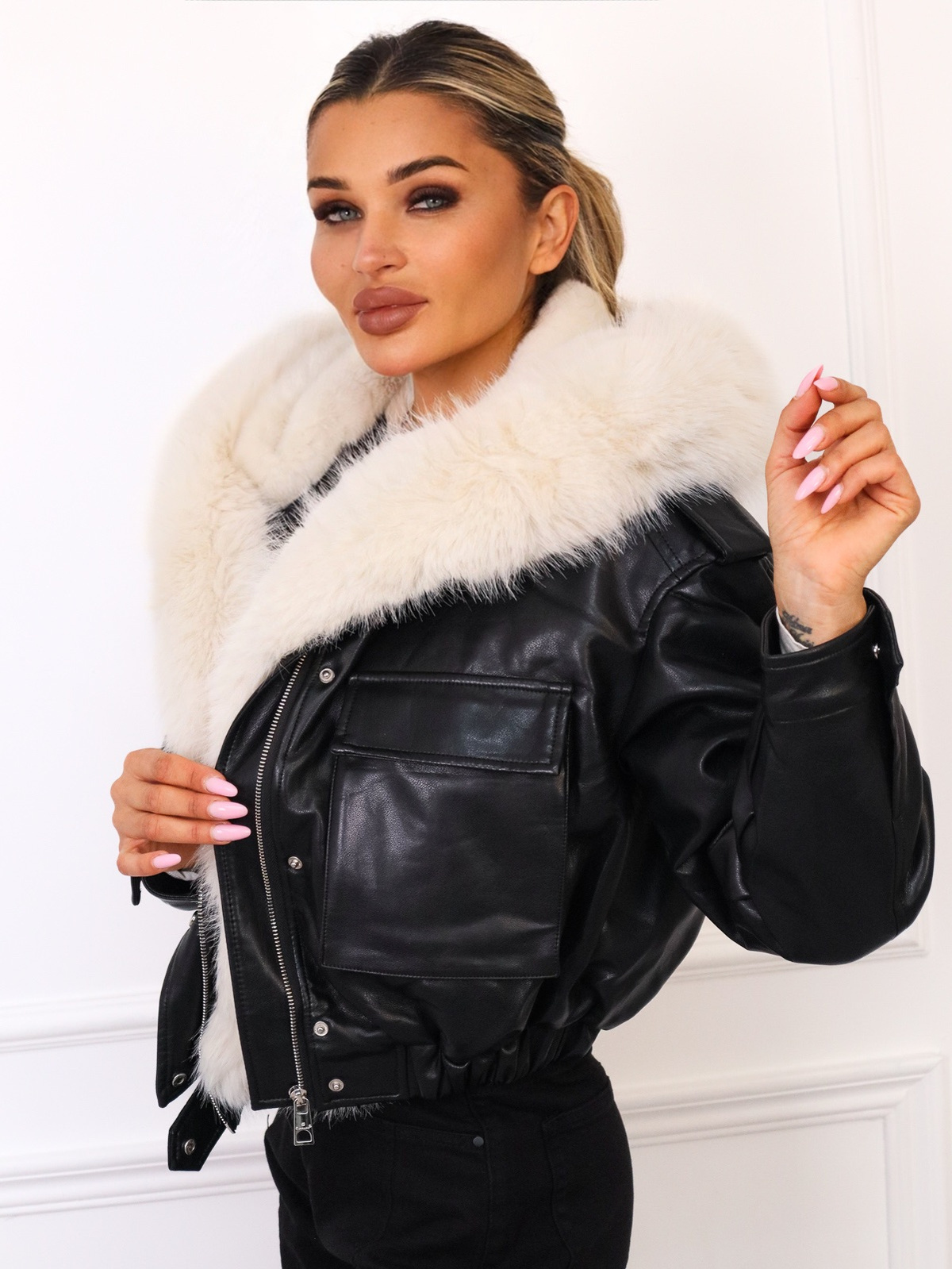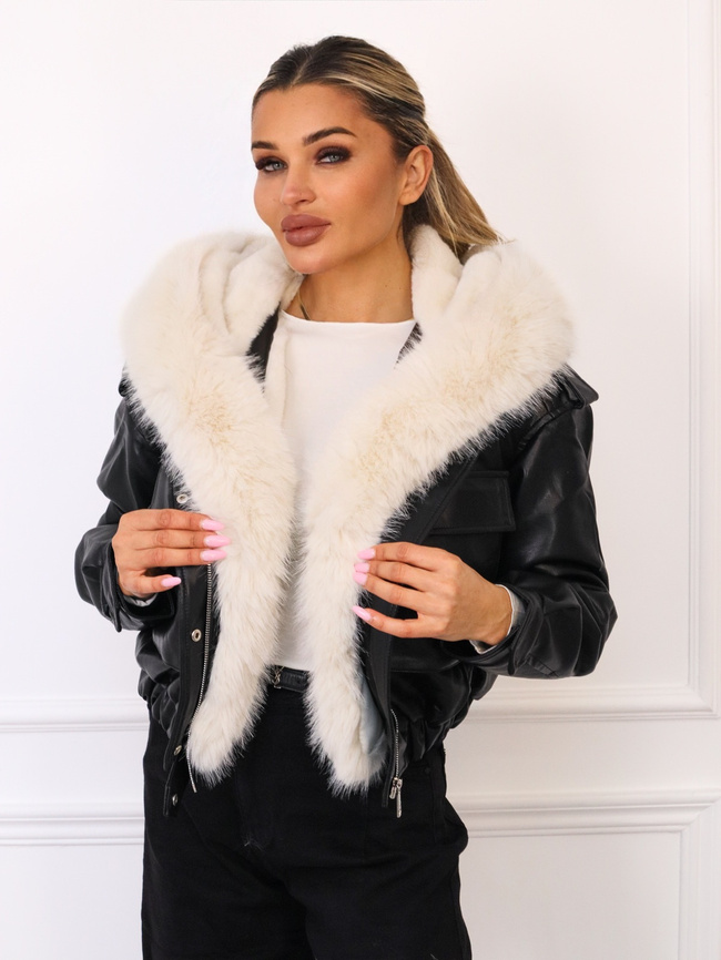 KURTKA Z IMITACJI SKÓRY Z OCIEPLENIEM I OZDOBNYM FUTERKIEM- CZARNA