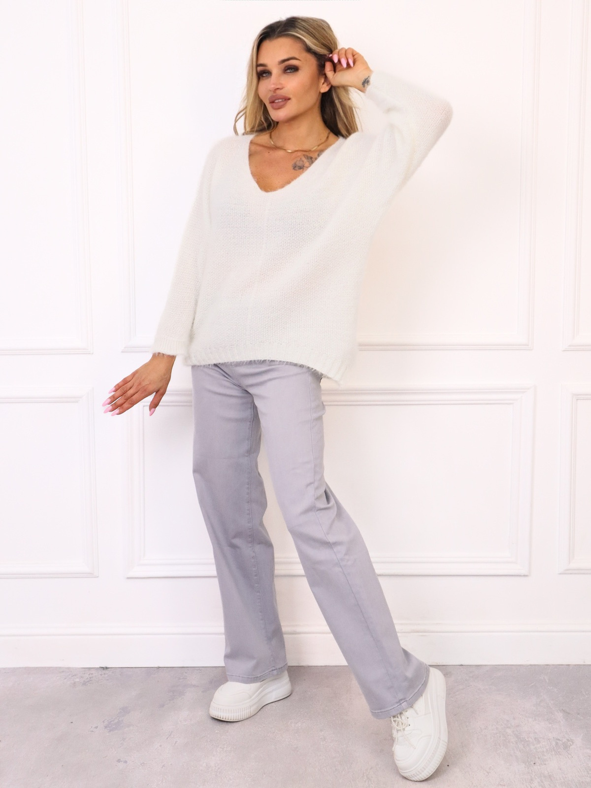 ASYMETRYCZNY SWETER Z DEKOLTEM W SZPIC Z DOMIESZKA WEŁNY I MOHERU- BIAŁY