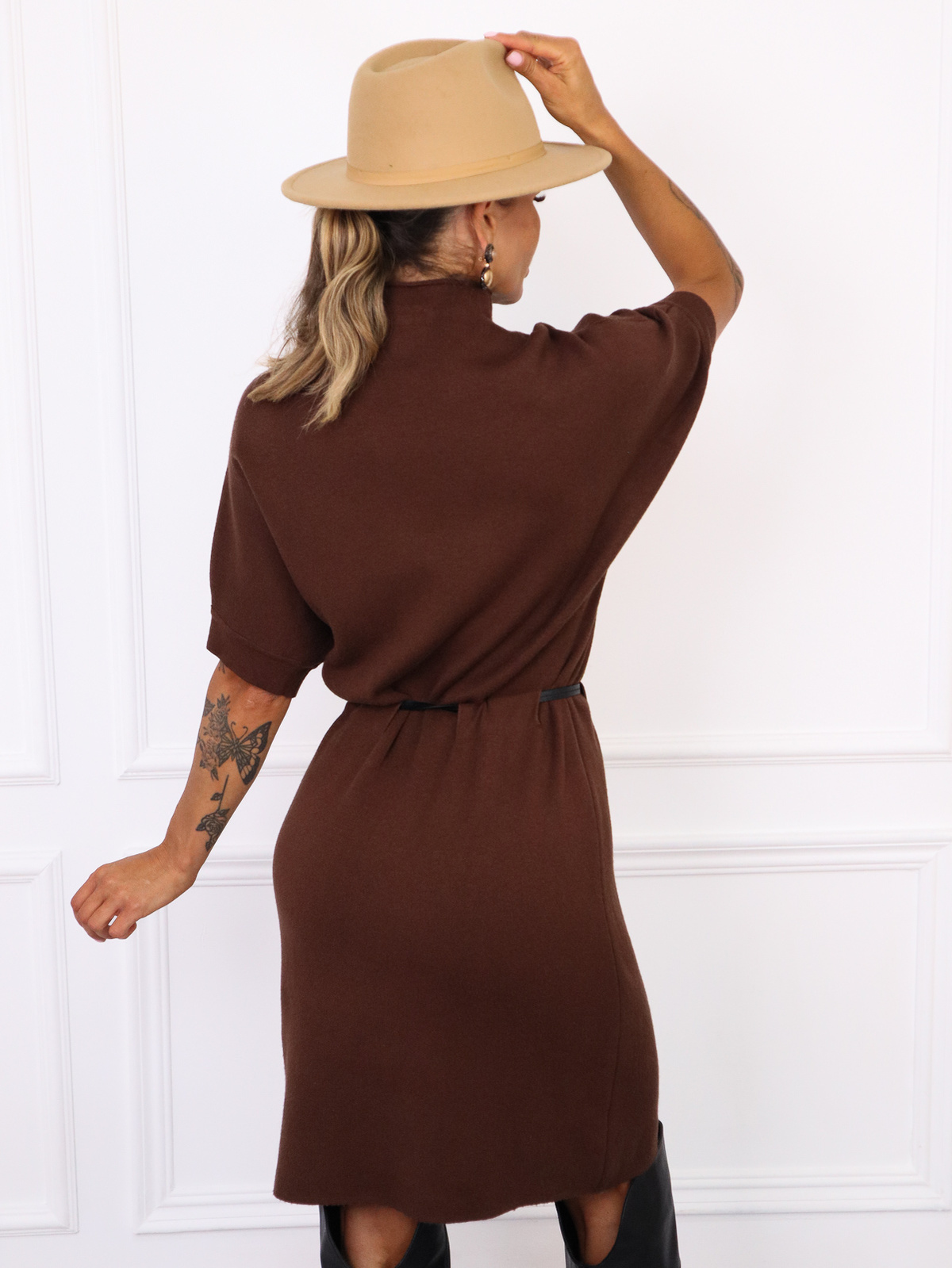 SUKIENKA SWETERKOWA Z PÓŁGOLFEM I PASKIEM- CIEMNY BRĄZ