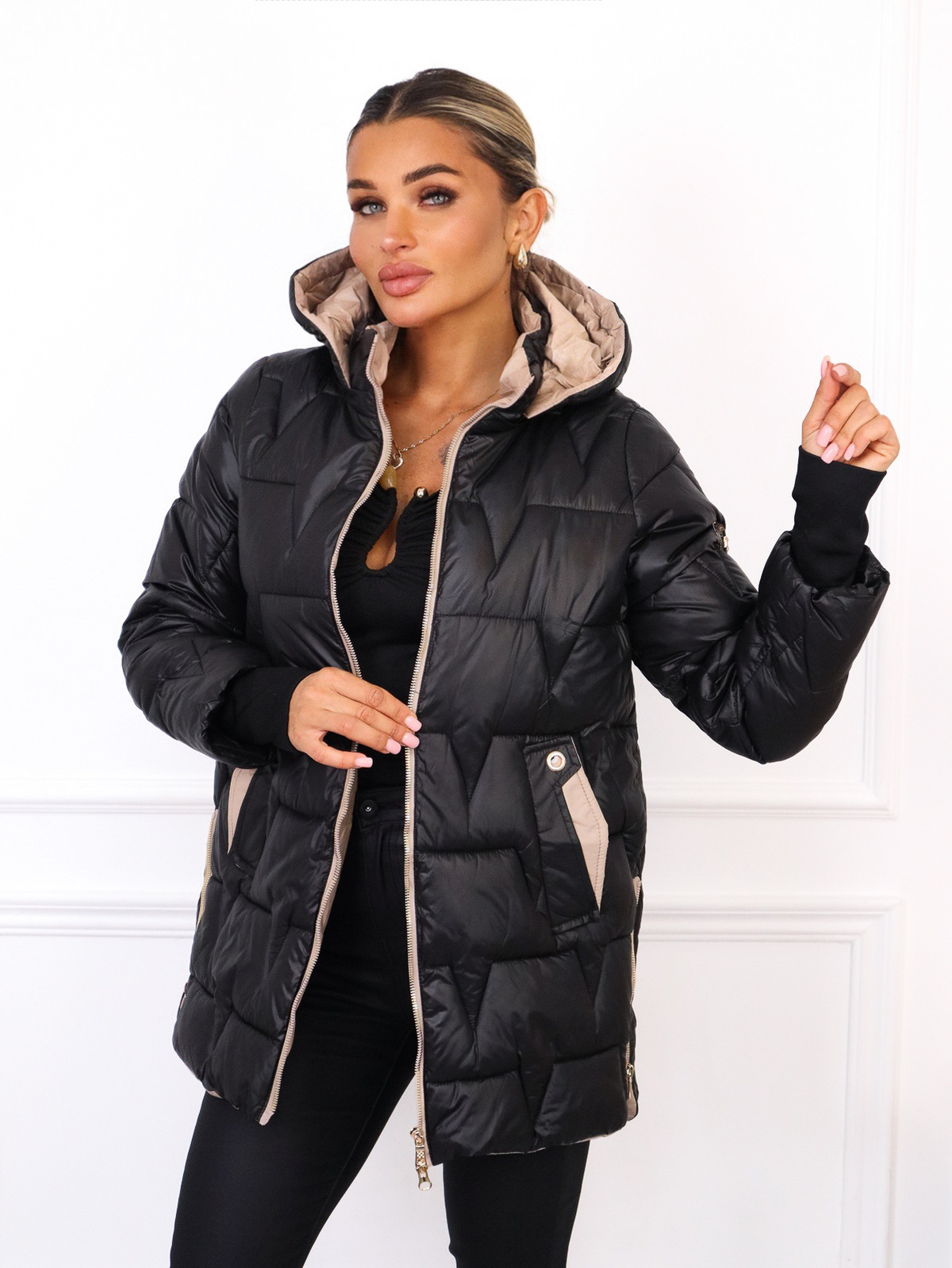 KURTKA PIKOWANA Z ZAMKAMI PO BOKACH- CZARNA