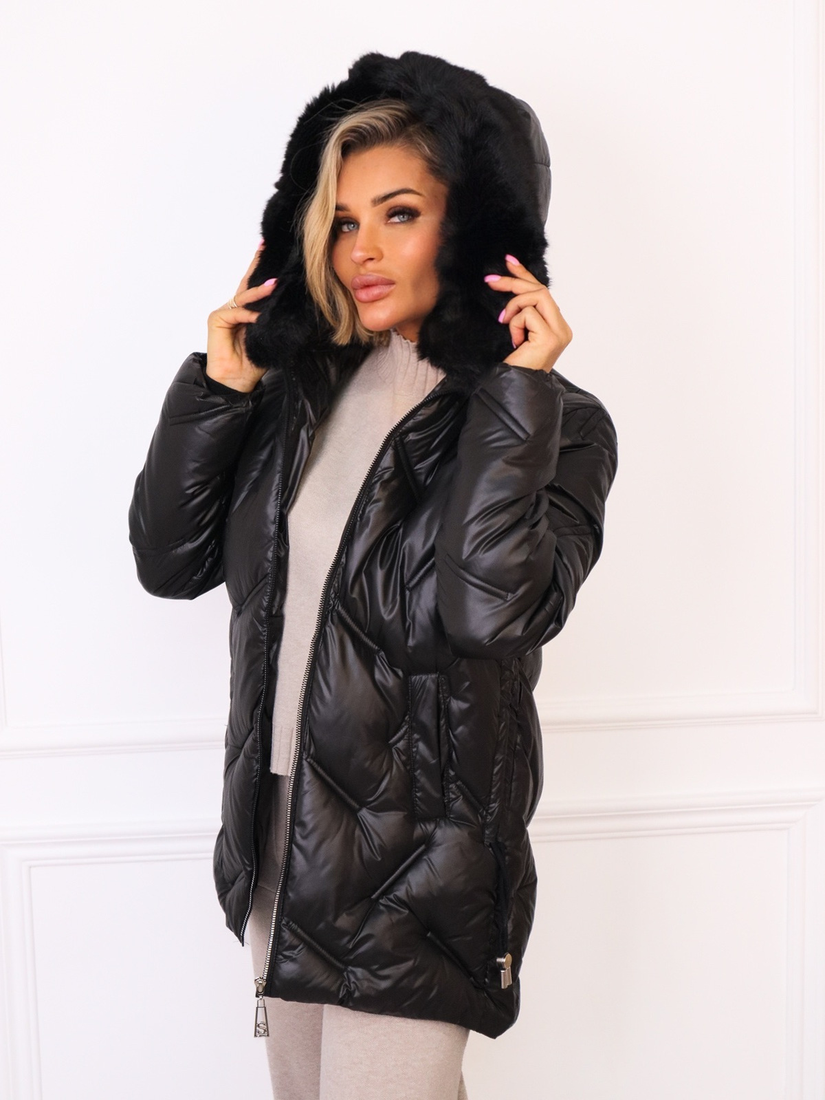 KURTKA ASYMETRYCZNA PIKOWANA Z FUTERKIEM- CZARNA