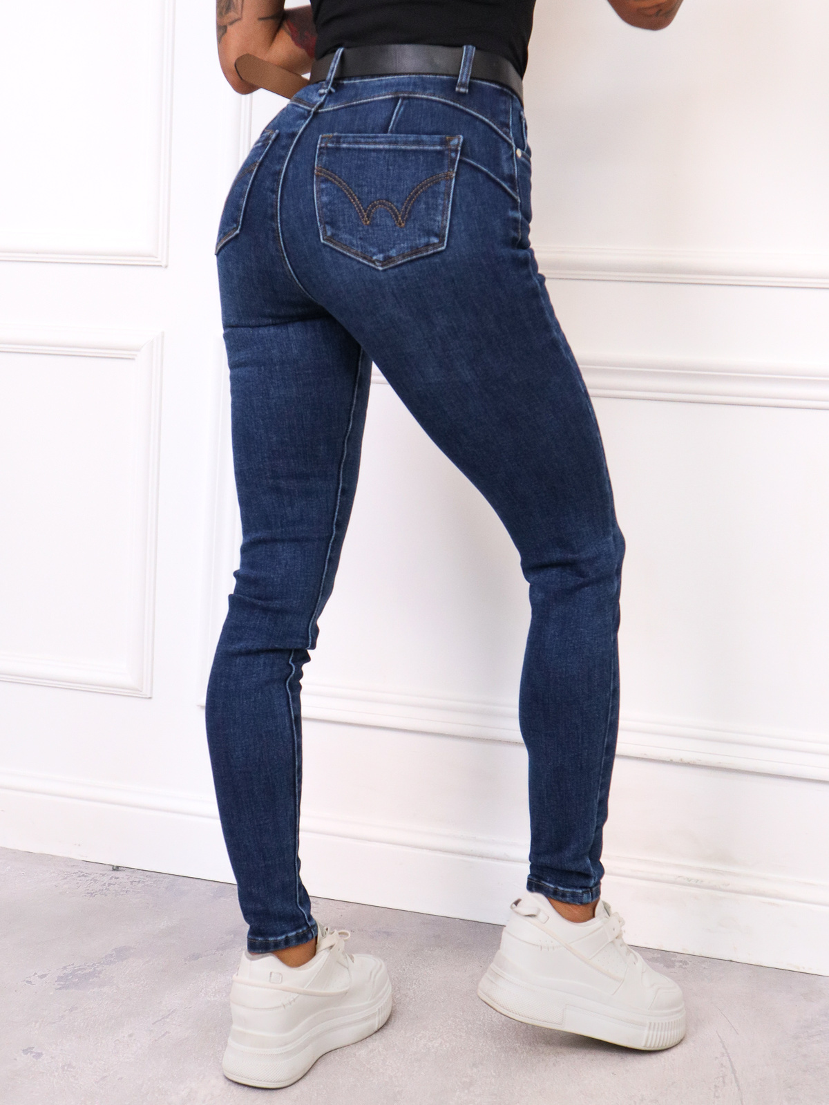 SPODNIE JEANSOWE SKINNY PUSH UP+ PASEK- GRANATOWE