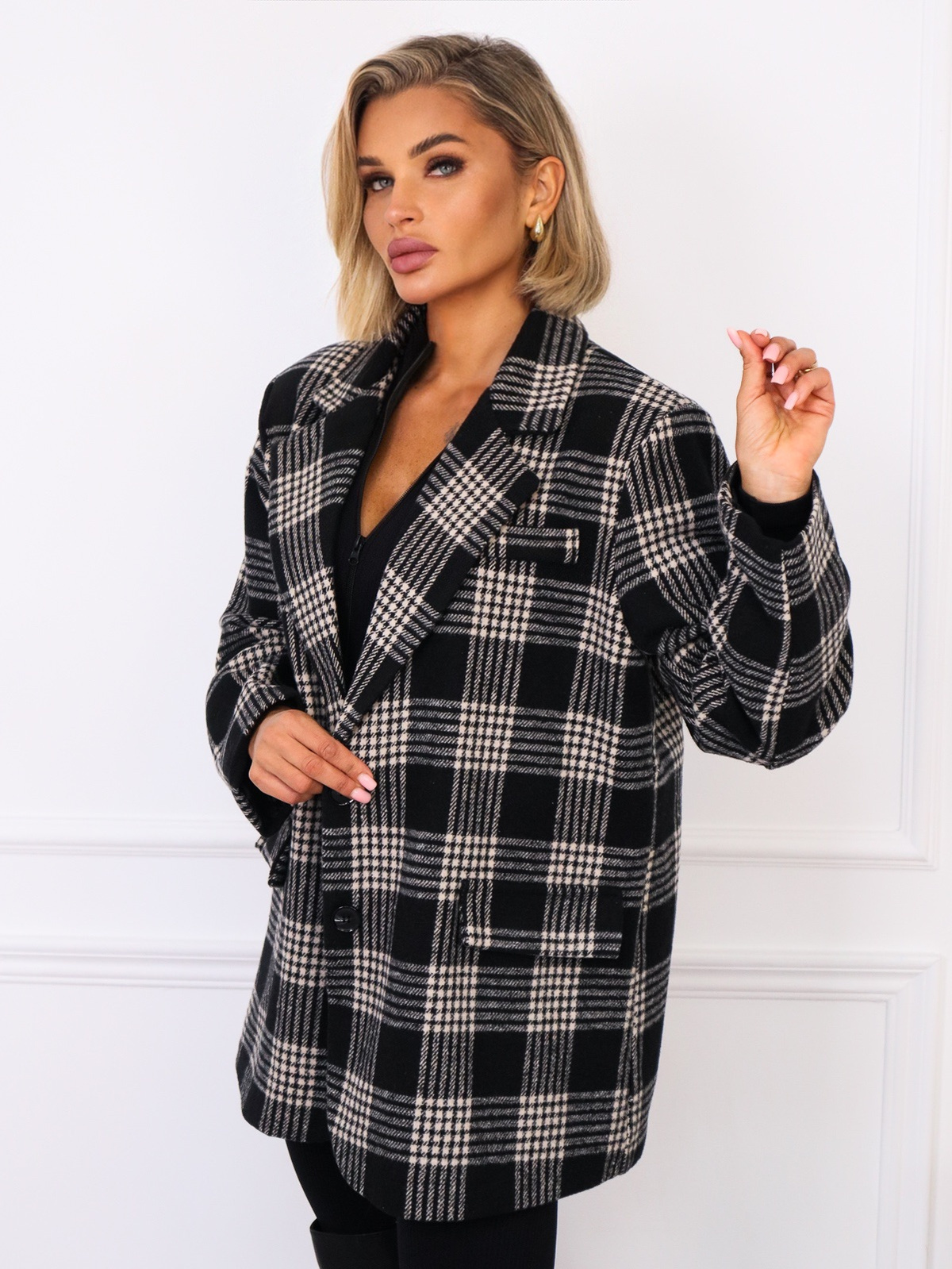 PŁASZCZ MARYNARKA ZAPINANY NA GUZIKI W KRATĘ- CZARNY
