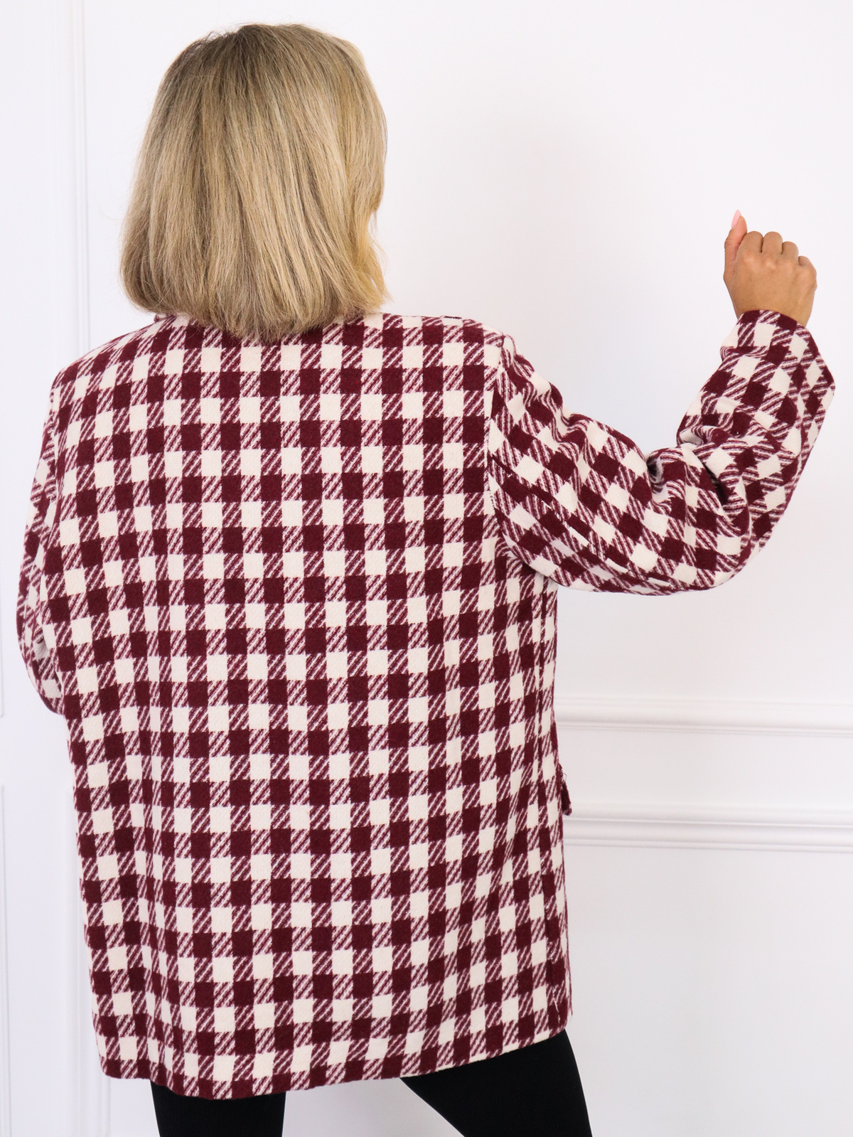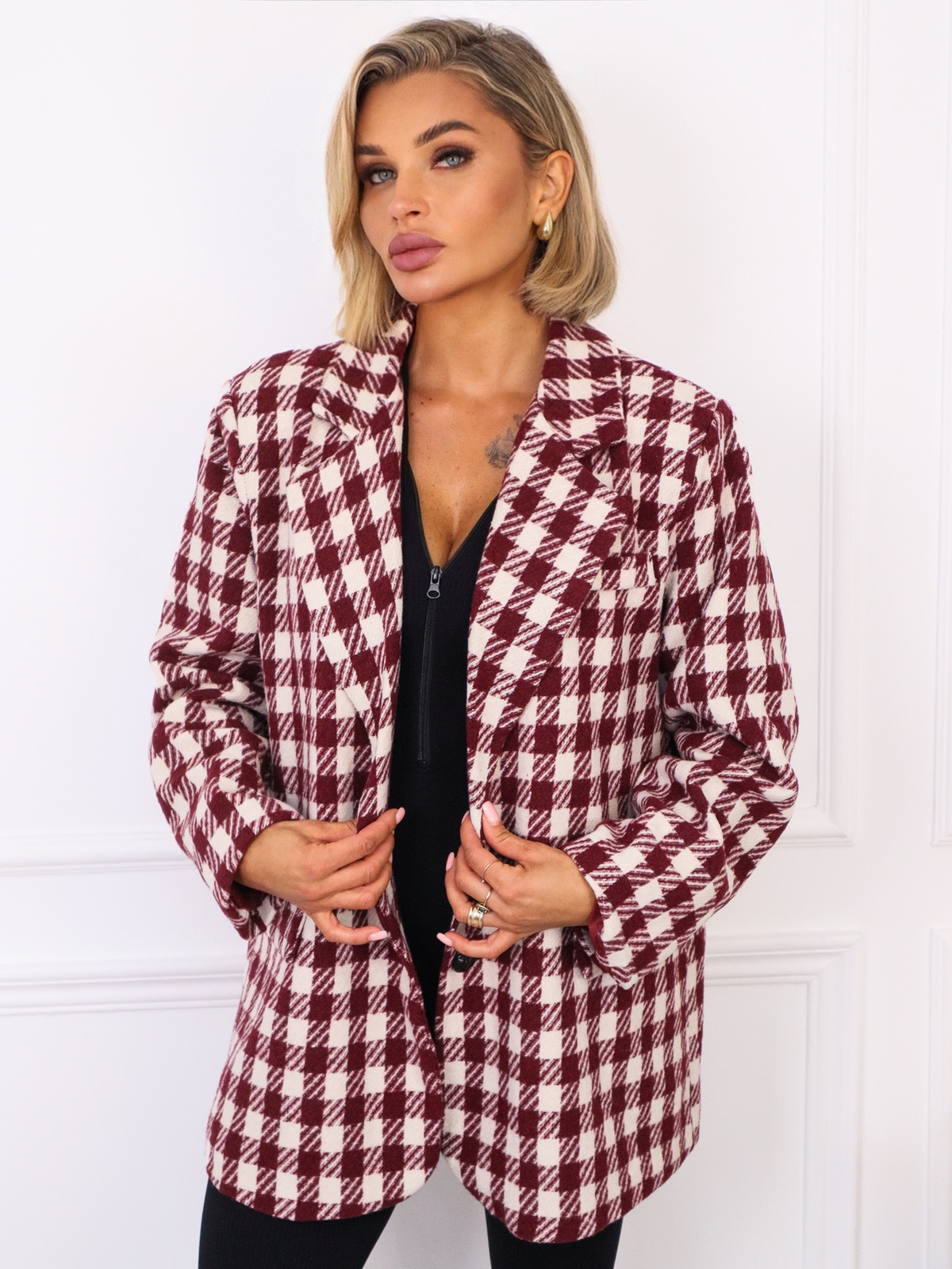 PŁASZCZ MARYNARKA W KRATKĘ ZAPINANY NA GUZIKI- BORDOWY