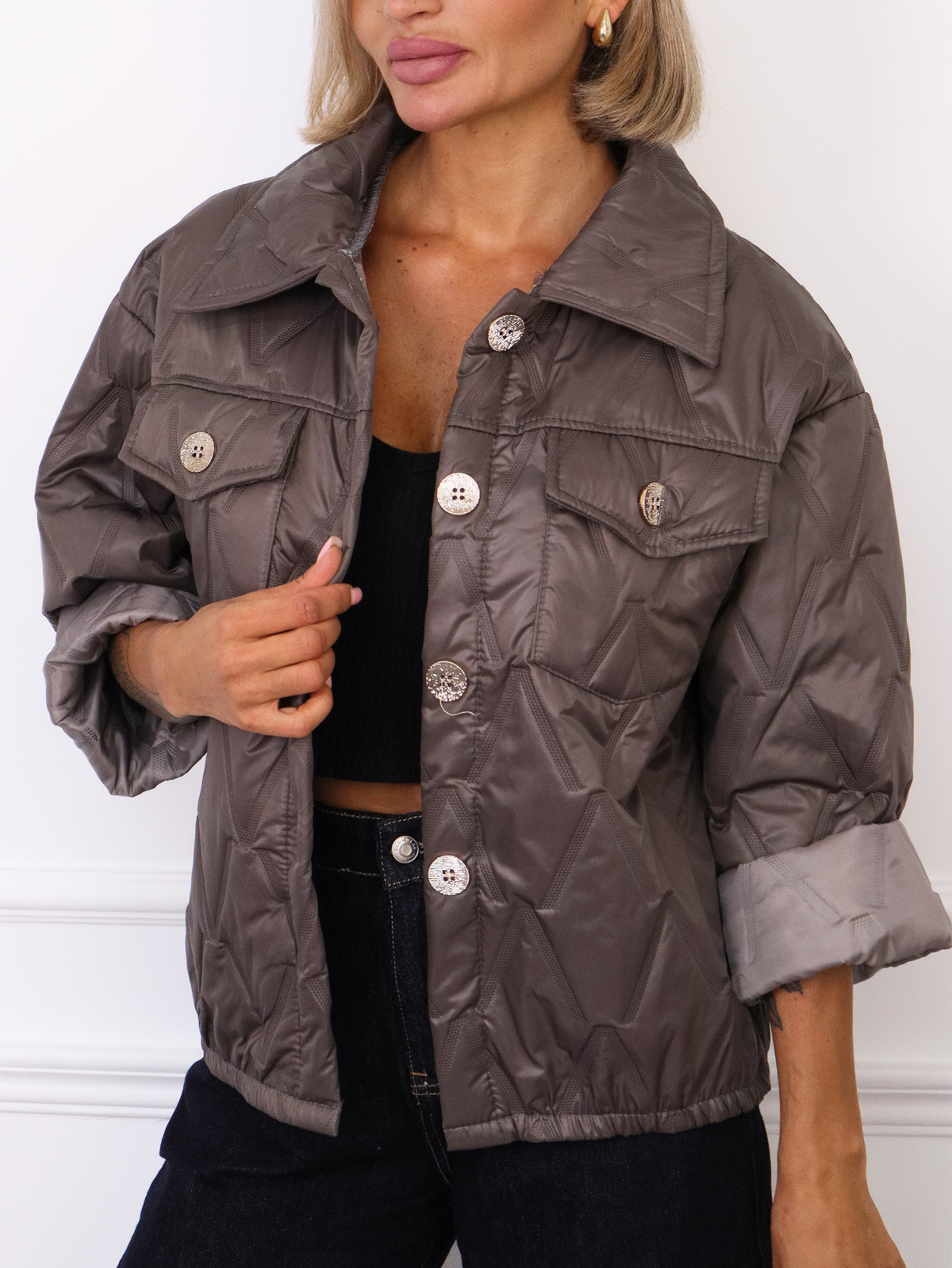 Kurtka przejściowa wykonana z pikowanej tkaniny z ozdobnym wzorem na całej powierzchni. Kurtka zapinana na złote guziki z kołnierzykiem. Na dole posiada gumkę.