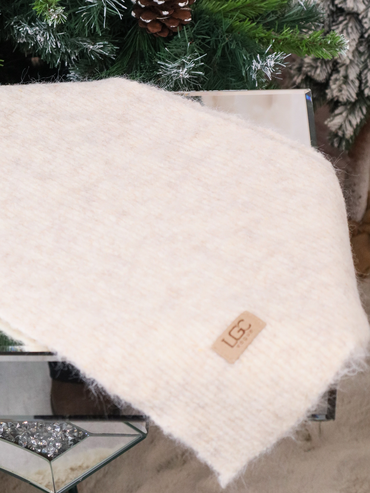 SZAL DZIANINOWY Z DOMIESZKĄ WEŁNY ORAZ LOGO- BEŻOWY