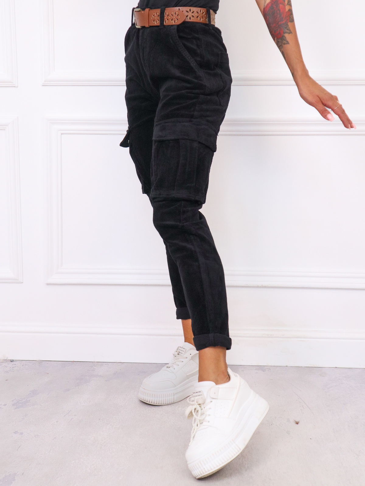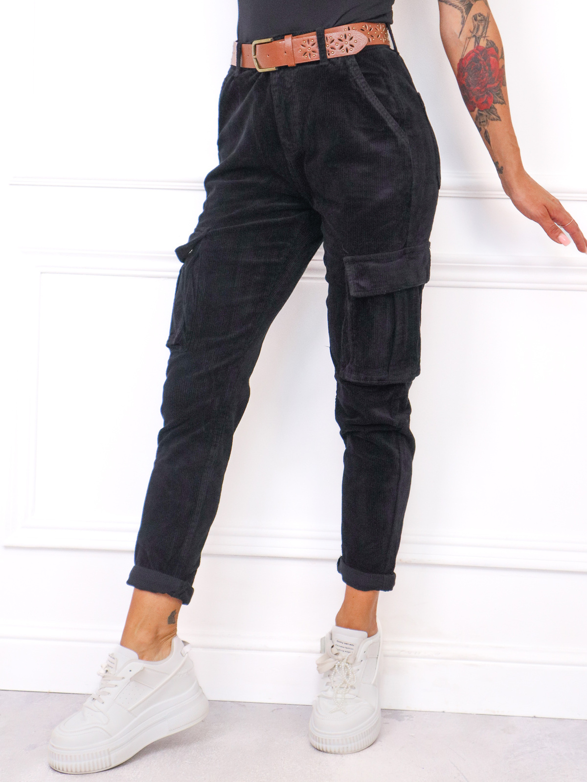 SPODNIE SZTRUKSOWE BOJÓWKI Z PASKIEM- CZARNE