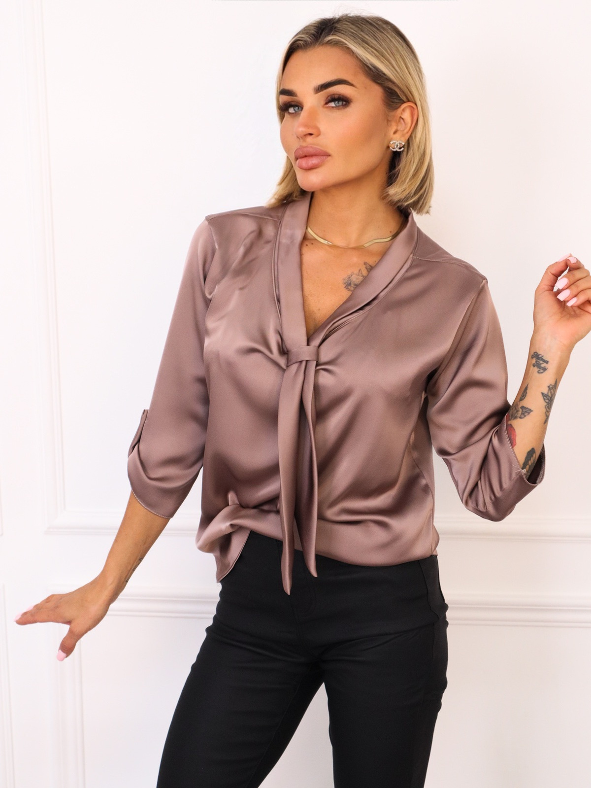 SATYNOWA BLUZKA Z OZDOBNYM WIĄZANIEM PRZY SZYI- BRĄZOWA