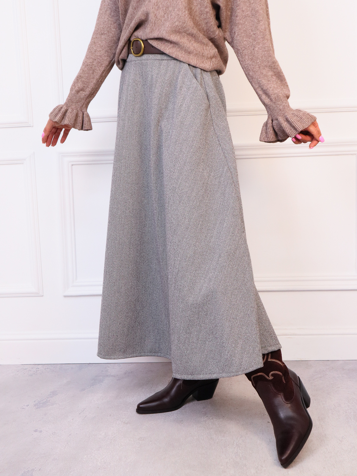 SPÓDNICA DZIANINOWA ROZKLOSZOWANA Z PASKIEM- SZARA
