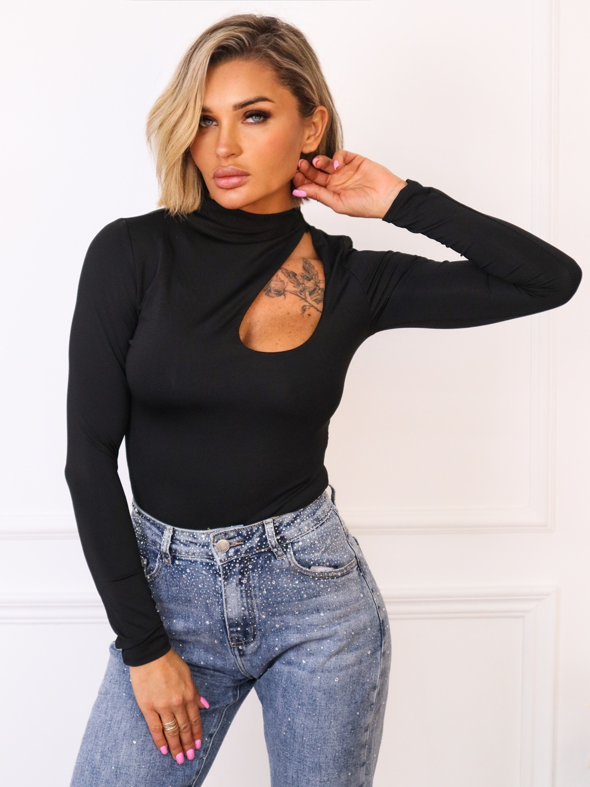 BODY Z WYCIĘCIEM I DŁUGIM RĘKAWEM- CZARNE