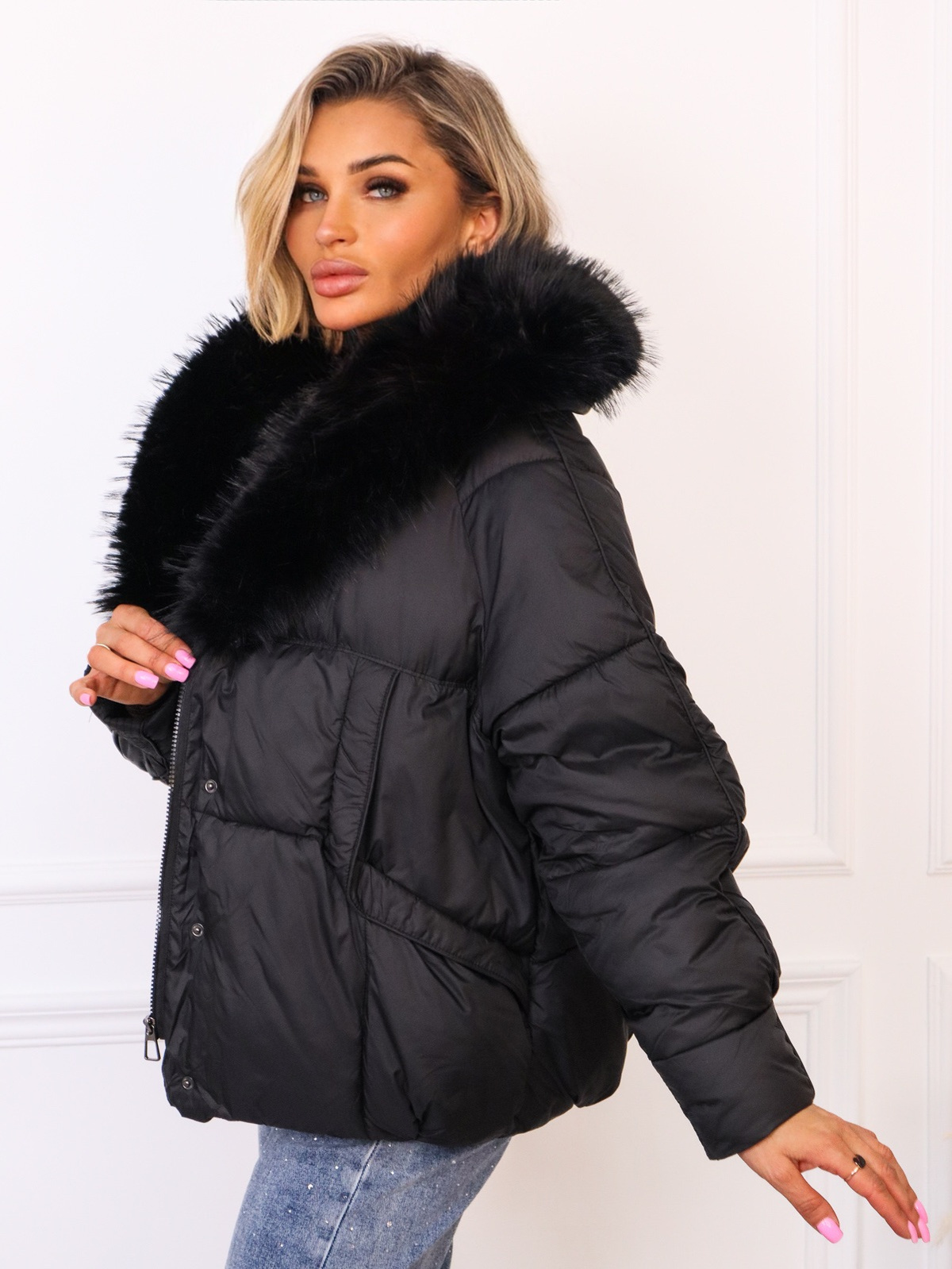 KURTKA Z FUTERKIEM ZAPINANA NA ZAMEK I ZATRZASKI- CZARNA