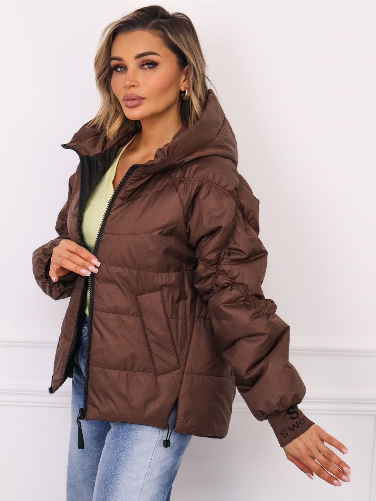 KURTKA Z OZDOBNYMI PRZESZYCIAMI NA RĘKAWACH I PRZEDŁUŻANYM ŚCIĄGACZEM- CZEKOLADOWA