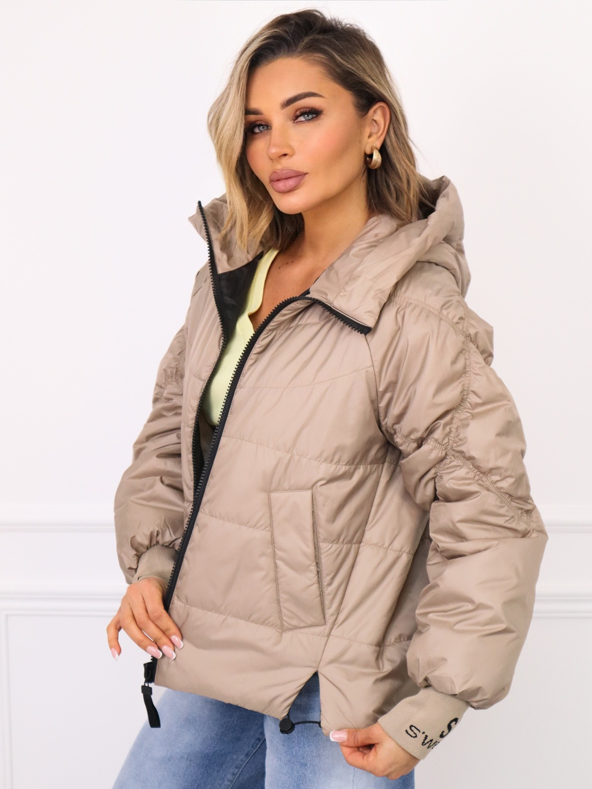 KURTKA Z OZDOBNYMI PRZESZYCIAMI NA RĘKAWACH I PRZEDŁUŻANYM ŚCIĄGACZEM- CZEKOLADOWA