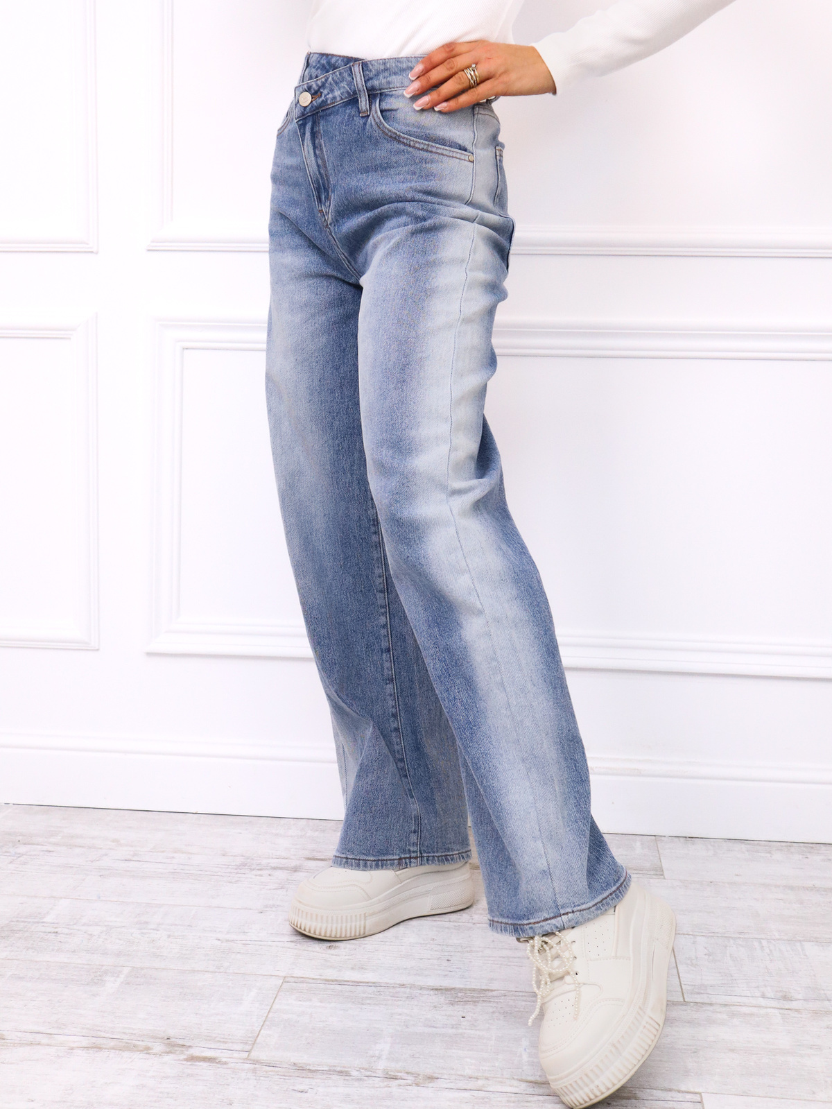 SPODNIE JEANSOWE Z SZEROKIMI NOGAWKAMI I ASYMETRYCZNYM PASEM- NIEBIESKIE