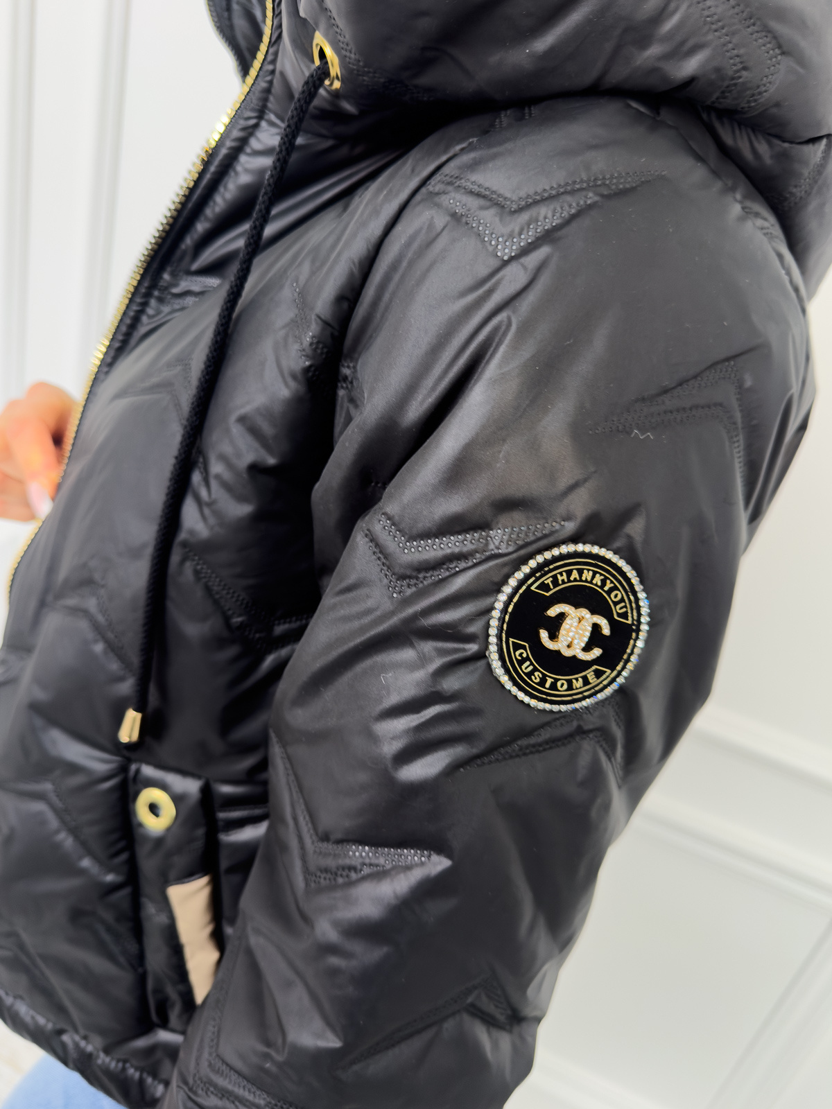 Kurtka przejściowa, pikowana z kapturem i ściągaczami po bokach.