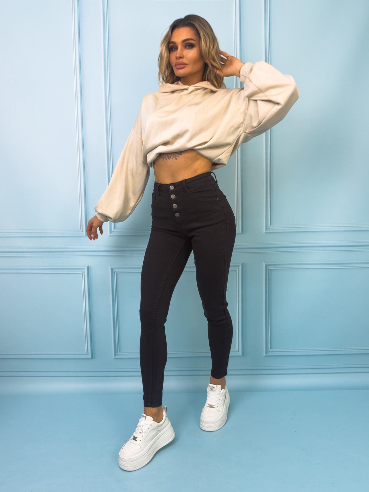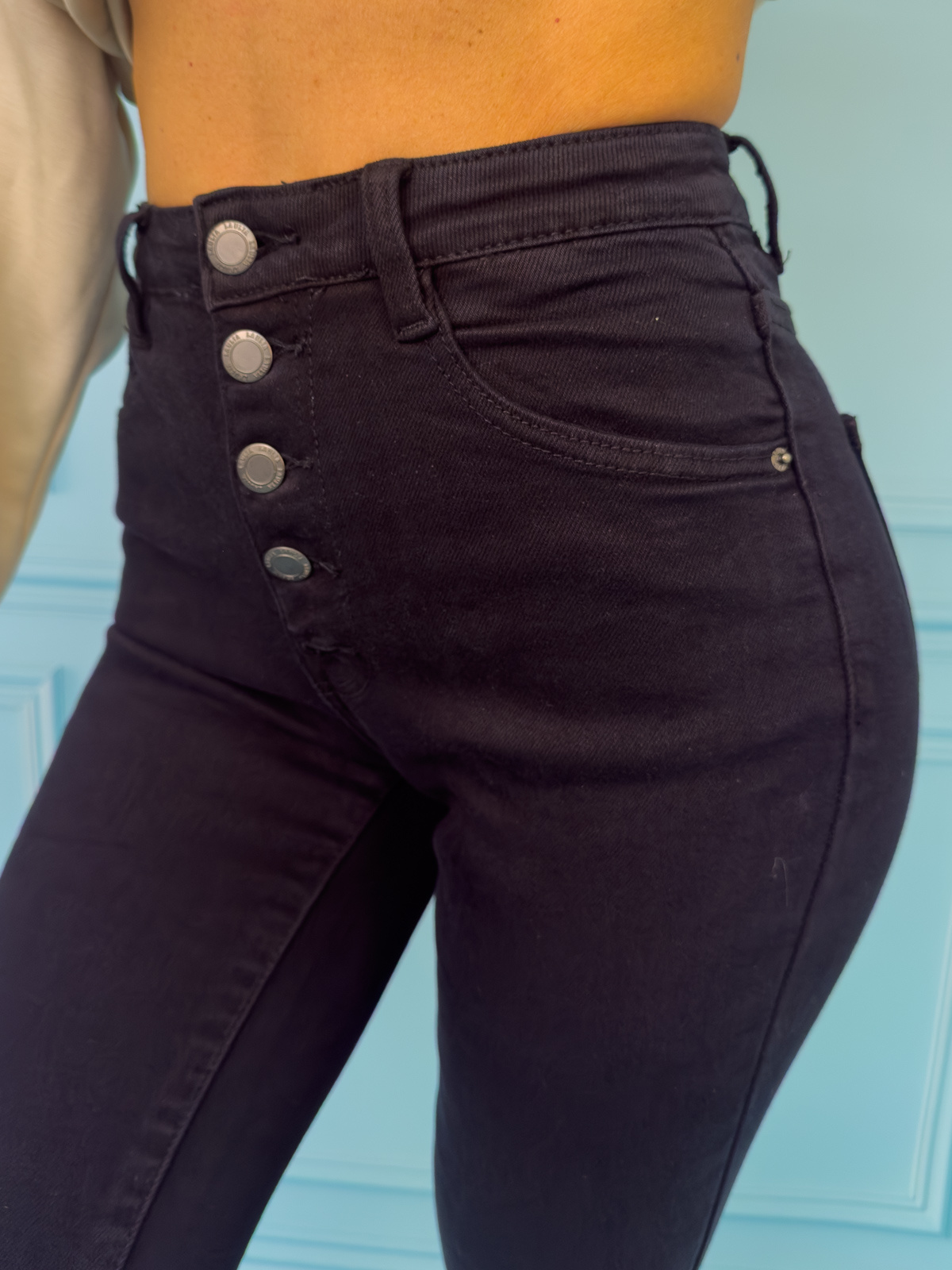 SPODNIE JEANSOWE Z WYSOKIM STANEM ZAPINANE NA GUZIKI- CZARNE