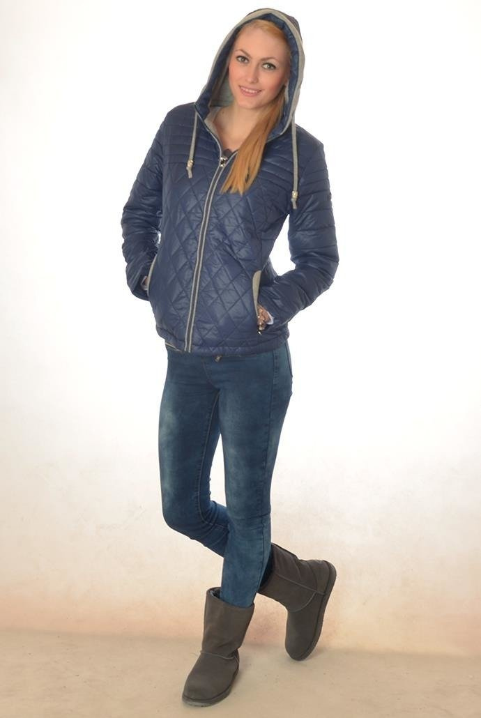 GRANATOWA KURTKA ORTALIONOWA PIKOWANA, ZAPINANA NA ZAMEK, KAPTUR ZE ŚCIĄGACZEM, SZARE MATERIAŁOWE WSTAWKI