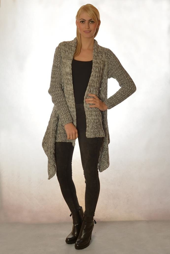 Beżowo-brązowa pleciona narzuta sweterkowa z dłuższymi bokami.