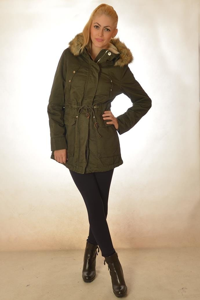 Zielony płaszcz zapinany na zamek. W środku obszyty futerkiem i wiązany w pasie. Kaptur obszyty sztucznym lisem.