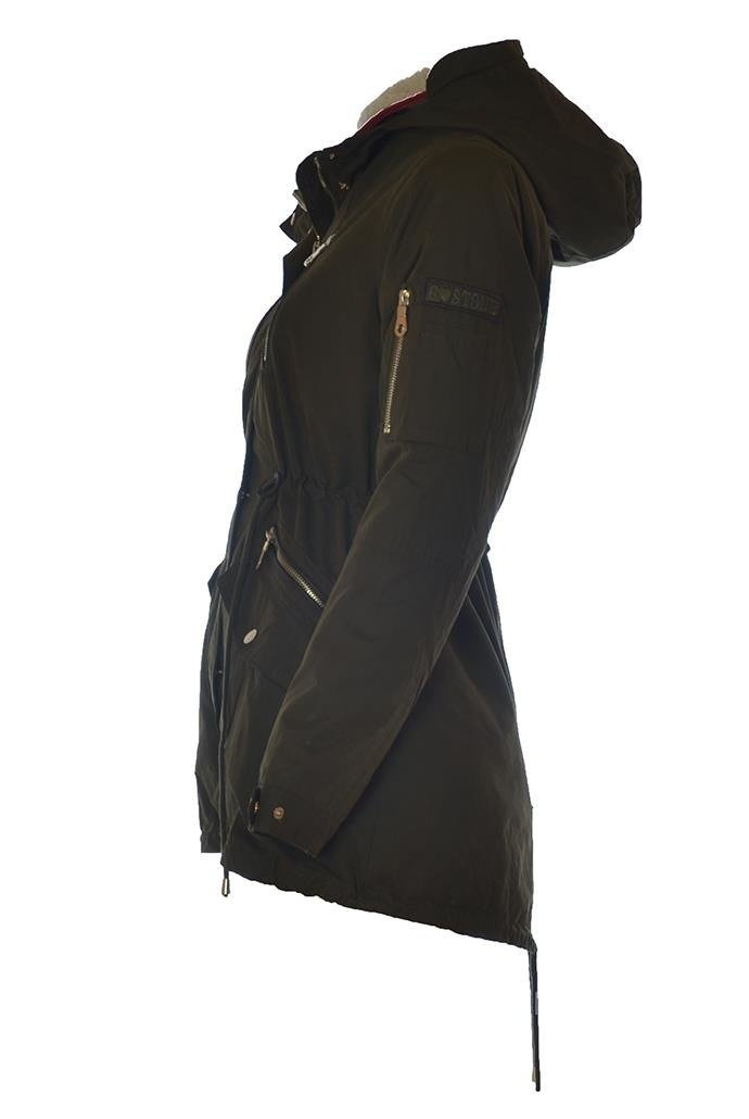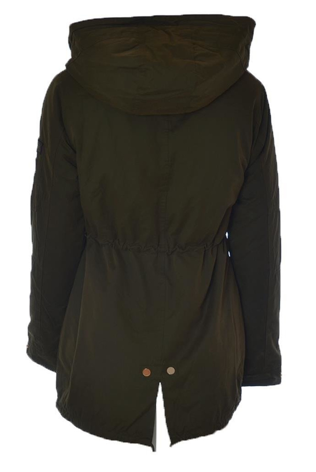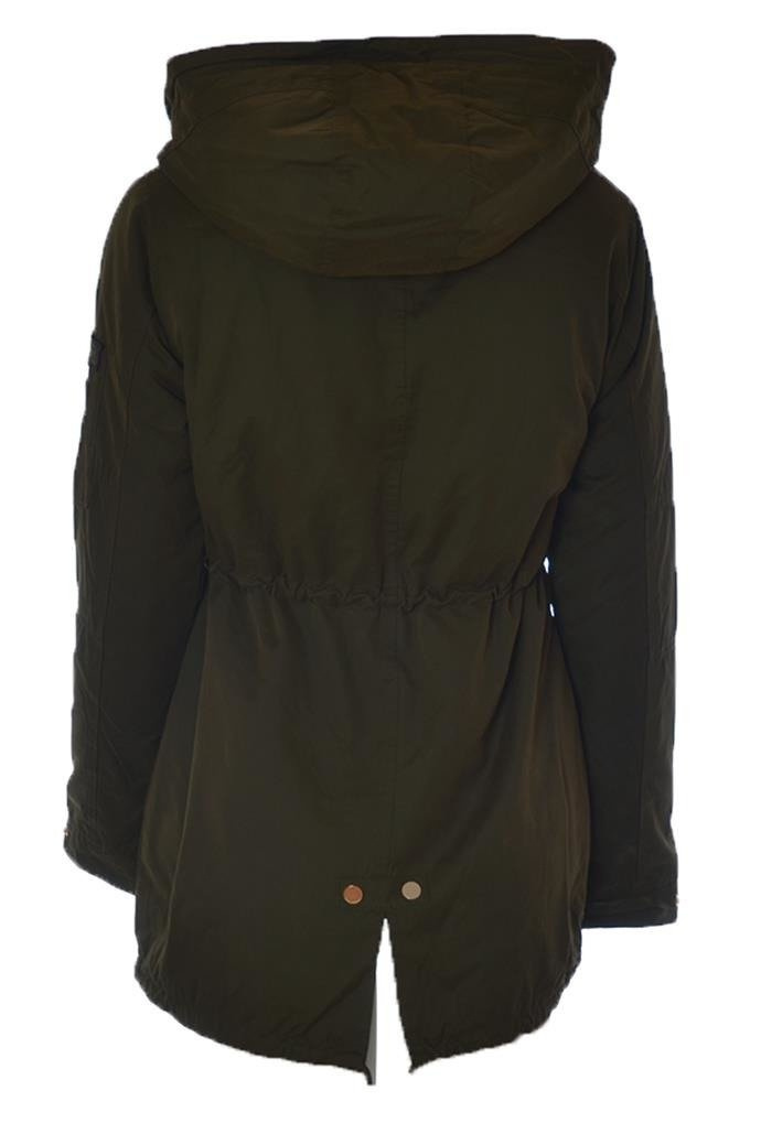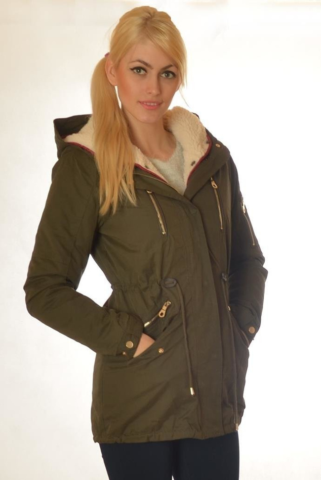 Zielona,ocieplana kurtka zimowa. Zapinana na zamek oraz wiązana w pasie sznurkiem. Kaptur ocieplany wełną.