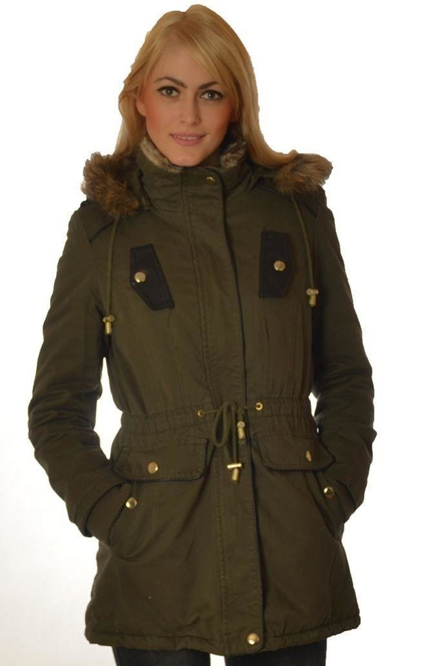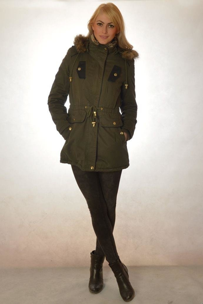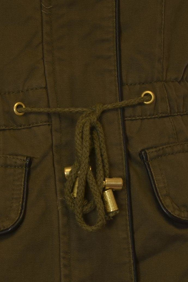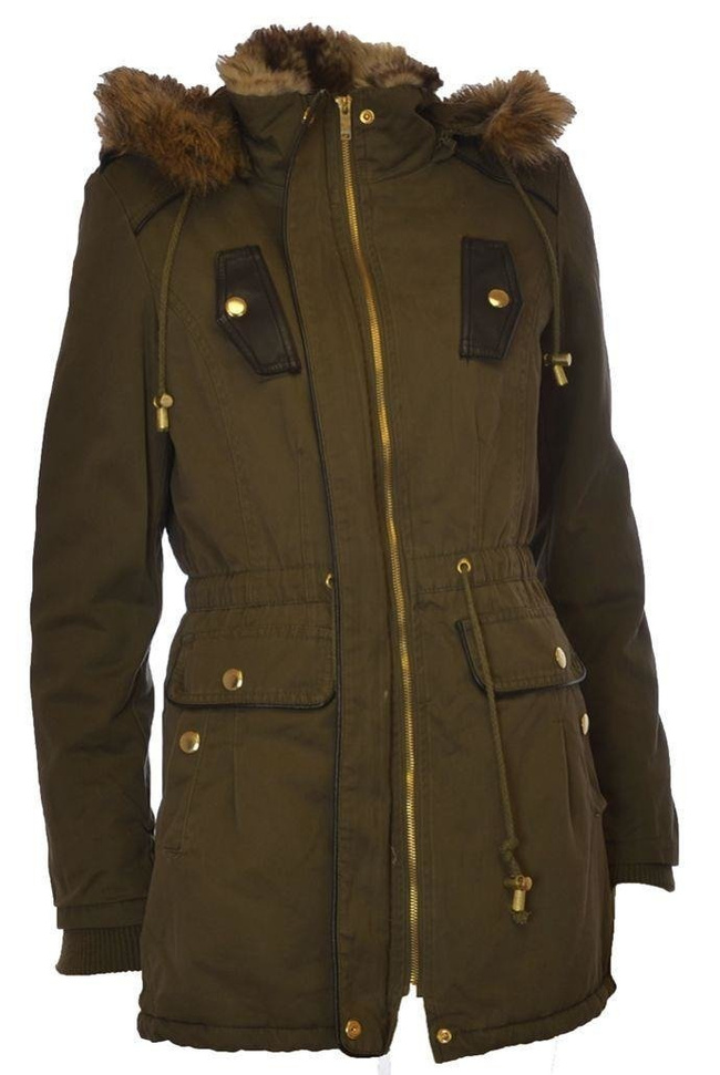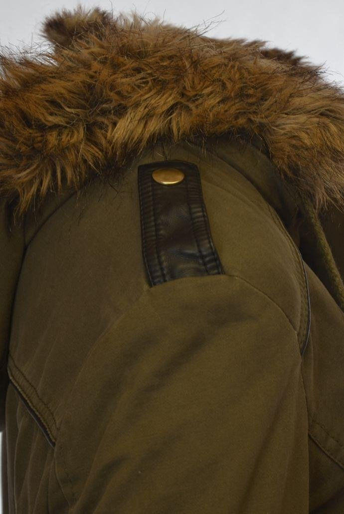 Bardzo ciepła, dłuższa kurtka z kapturem wykończonym futerkiem. Zapinana na zamek , oraz guziki, wiązana w talii, cztery kieszenie z przodu ze wstawkami skóry ekologicznej.