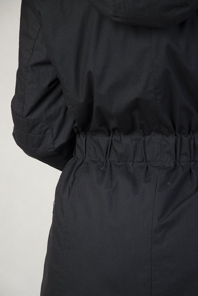 Dłuższa kurtka z kapturem wykończonym futerkiem. Zapinana na zamek, oraz guziki. Z tyłu ściągacz. Z przodu kurtka posiada zapinane pikowane kieszenie. Idealna na chłodniejsze dni.