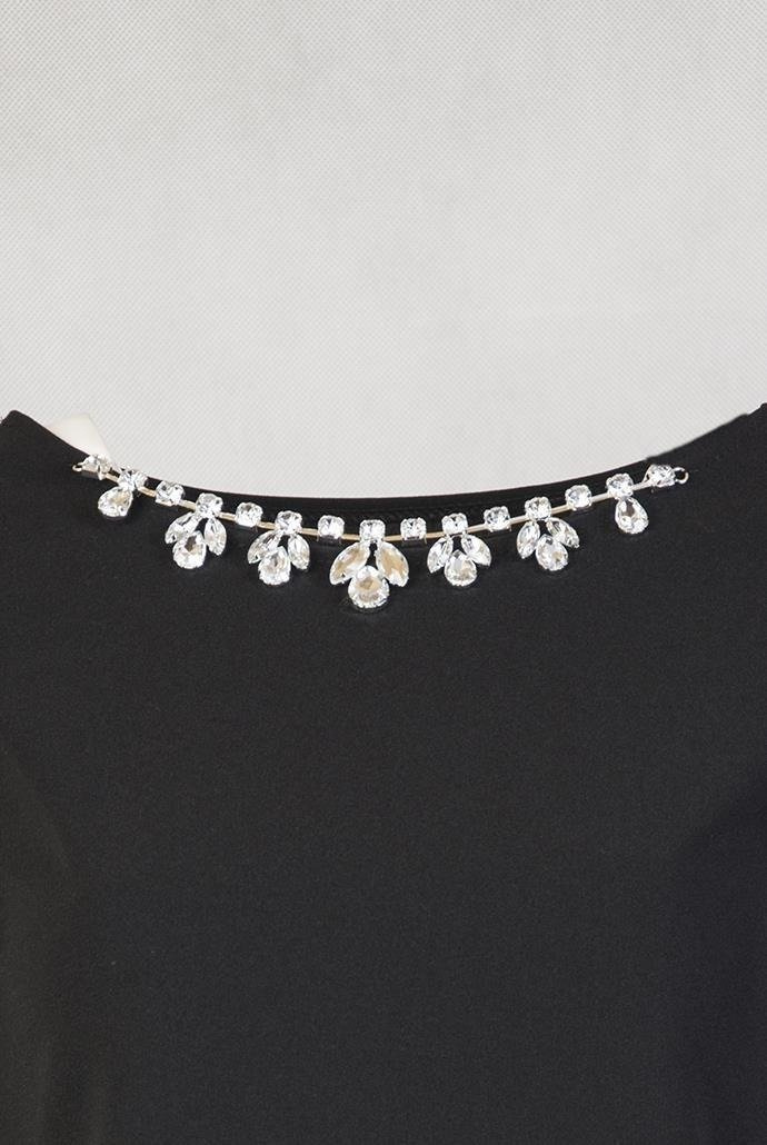 Czarna bluzka z cyrkoniami przy dekolcie.