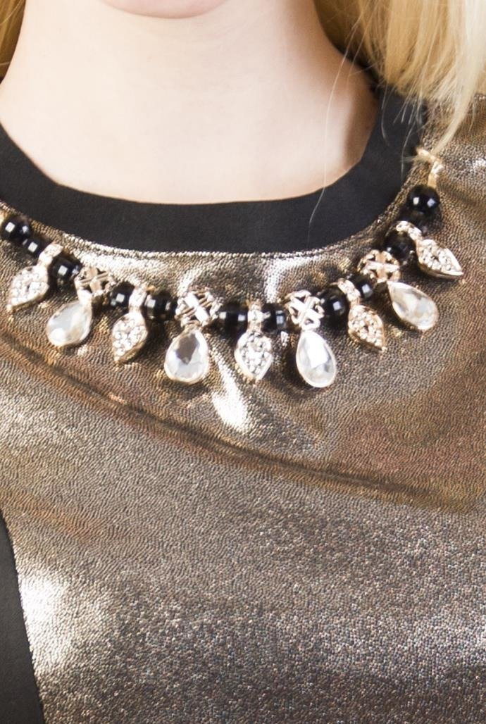 Czarno-złota sukienka z wisiorkiem przy dekolcie.