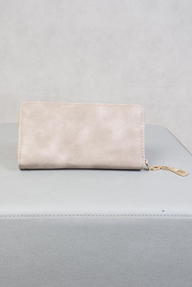 Beżowy portfel ze złotym zamkiem, breloczkiem oraz kokardką