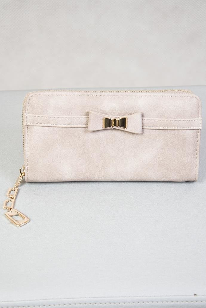 Beżowy portfel ze złotym zamkiem, breloczkiem oraz kokardką.