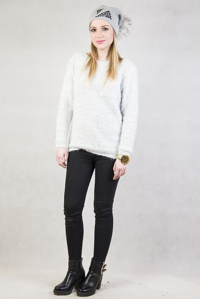 Jasno-szara czapka z doszytymi trójkątami oraz cekinami.