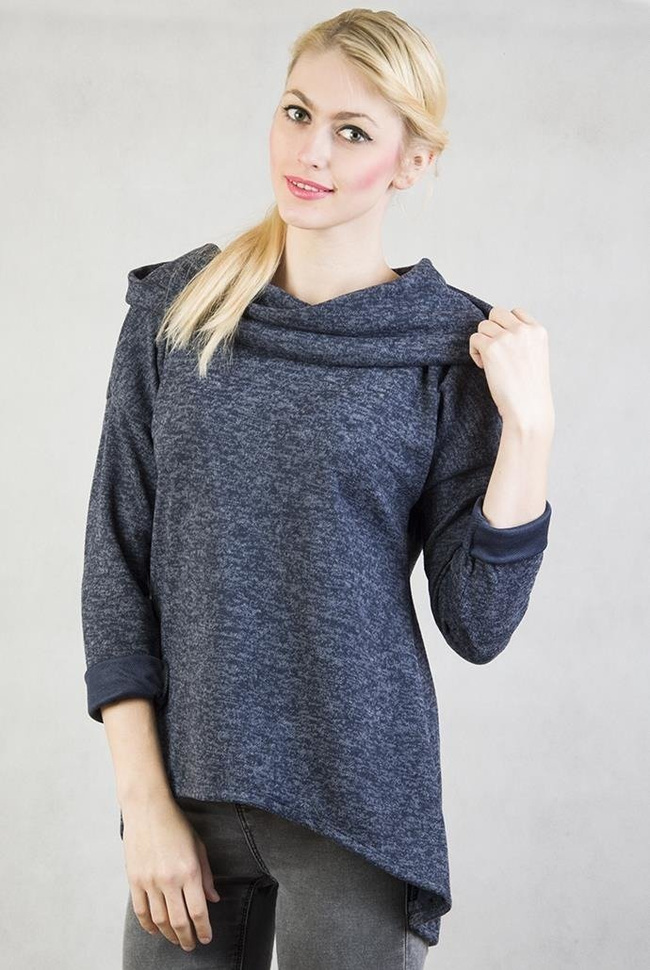 Granatowa, asymetryczna bluzka z kapturem-kominem.