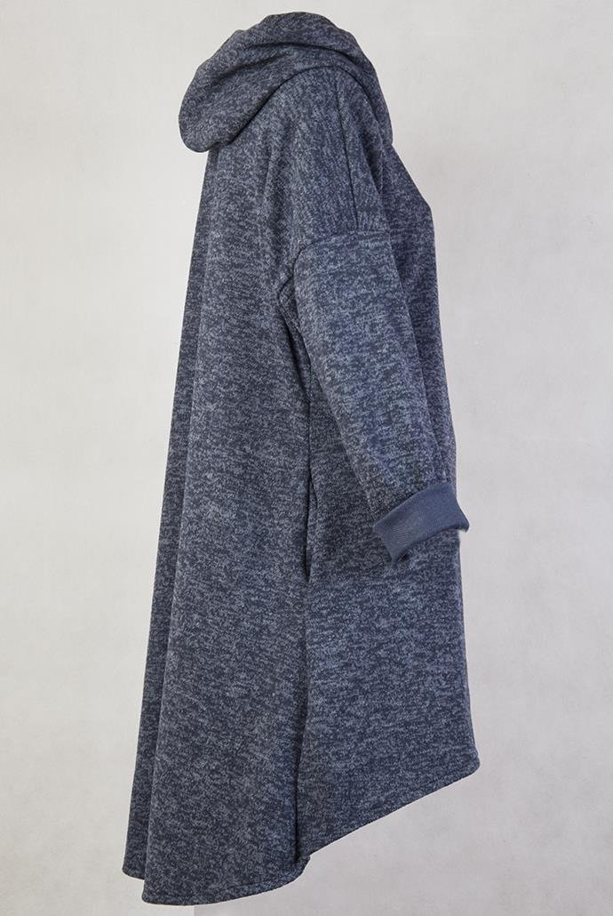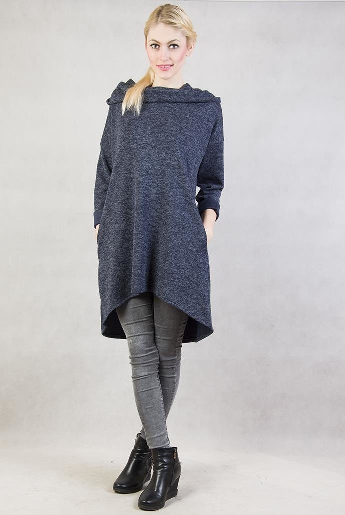 Granatowa, asymetryczna tunika z wywijanym kołnierzem.