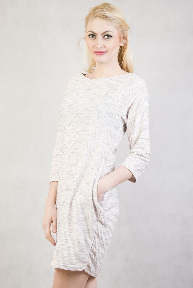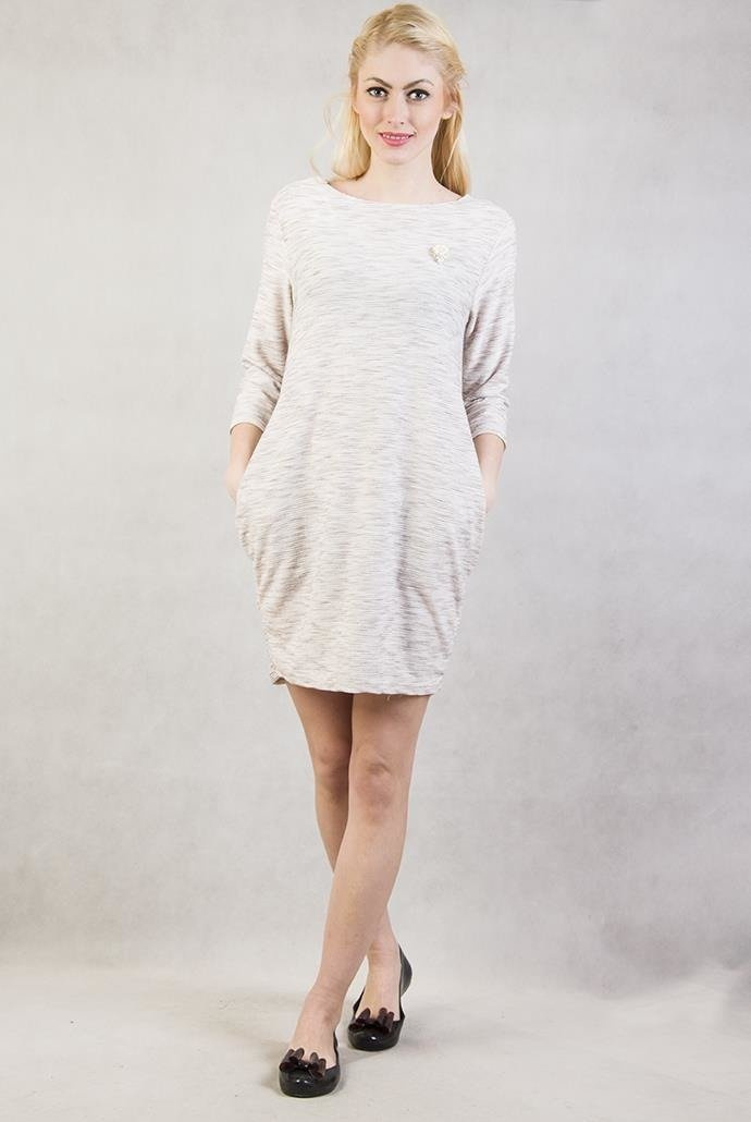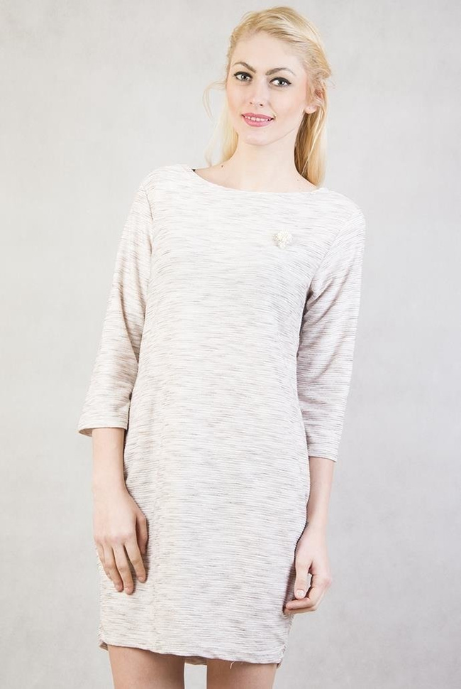 Beżowa tunika z dwoma kieszeniami oraz broszką