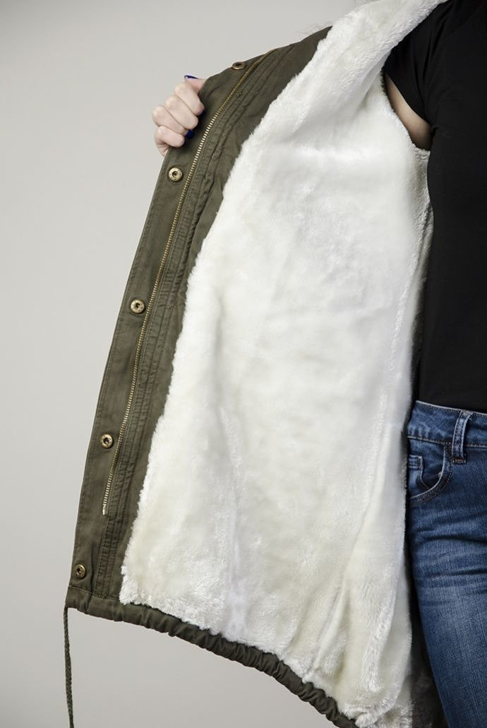 Kurtka khaki typu parka z białym futerkiem