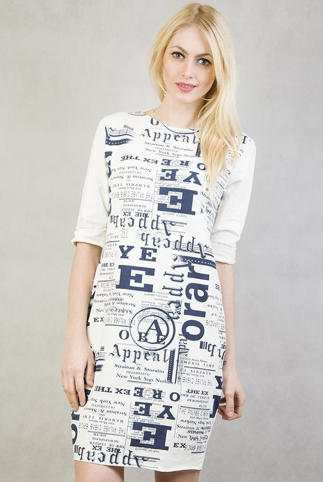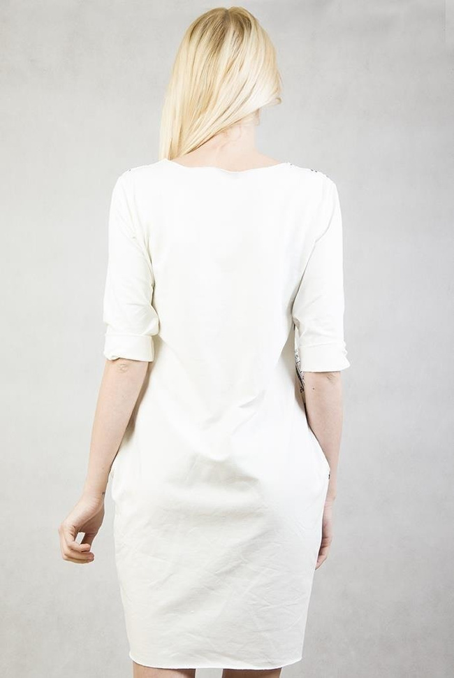 Biała tunika z różnymi napisami oraz dwoma kieszeniami po bokach.