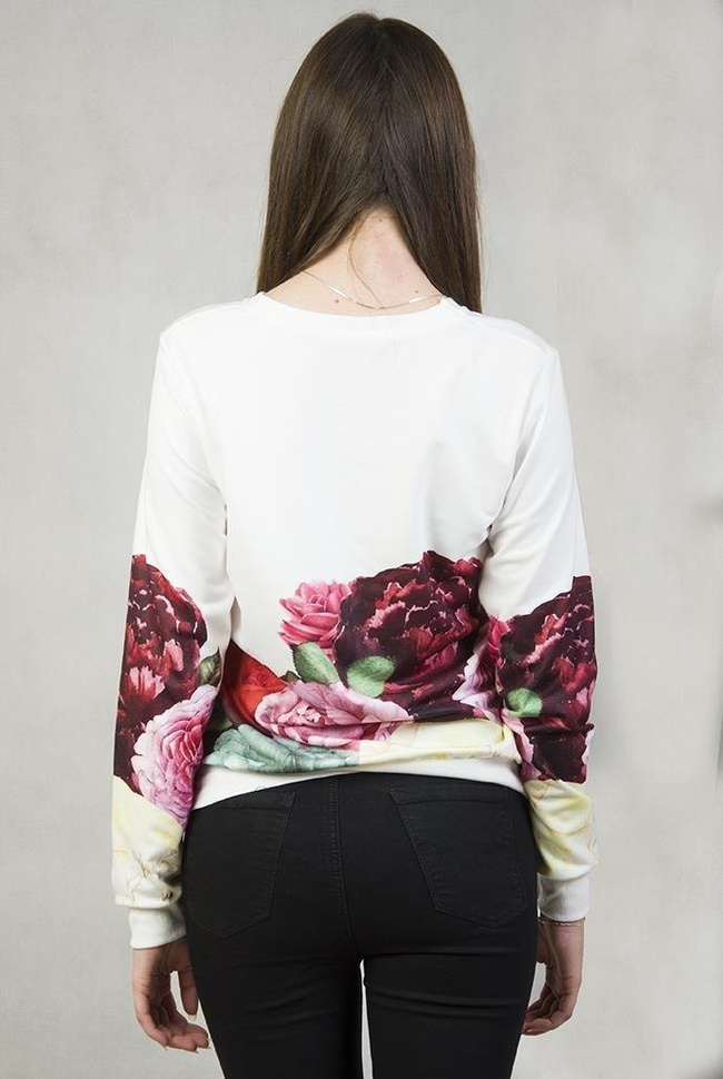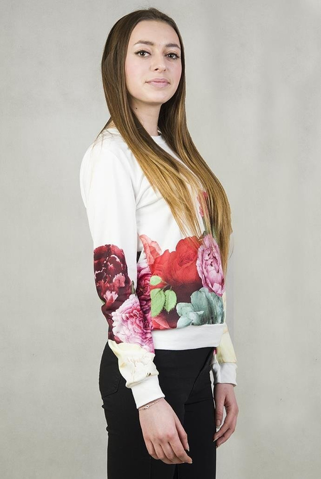 Biała bluza z kolorowymi kwiatami oraz ściągaczem przy rękawach i na dole.