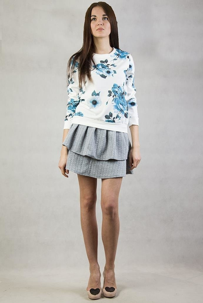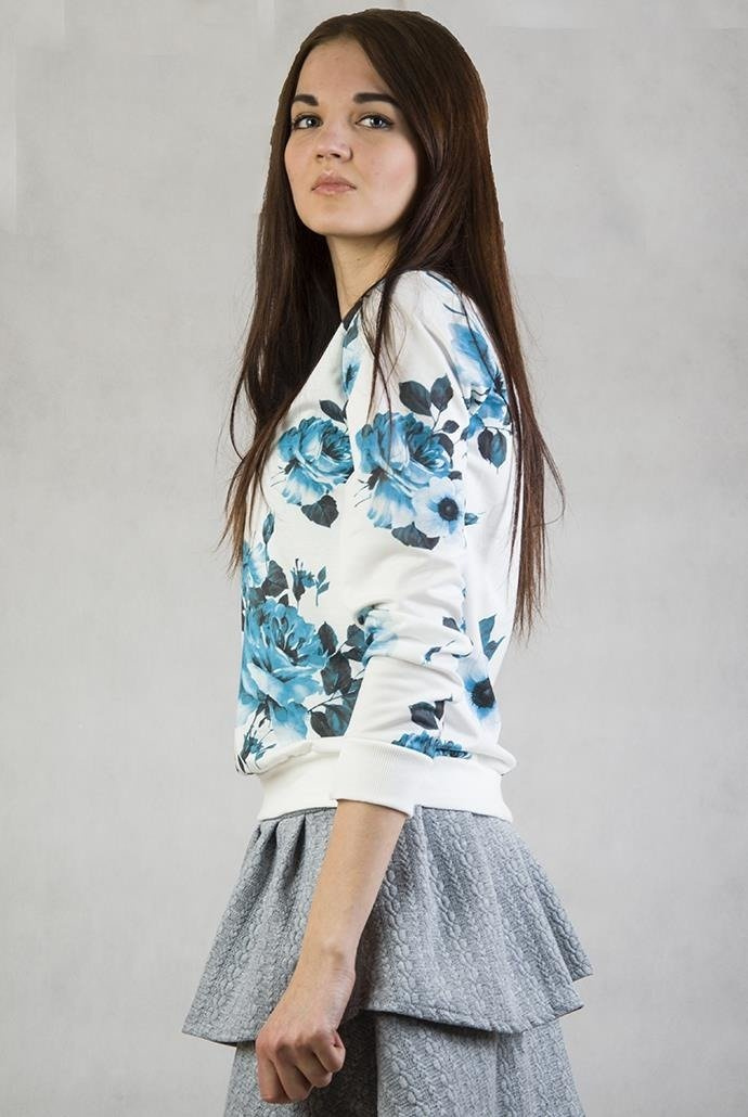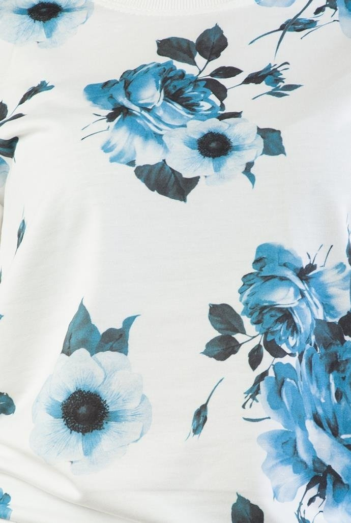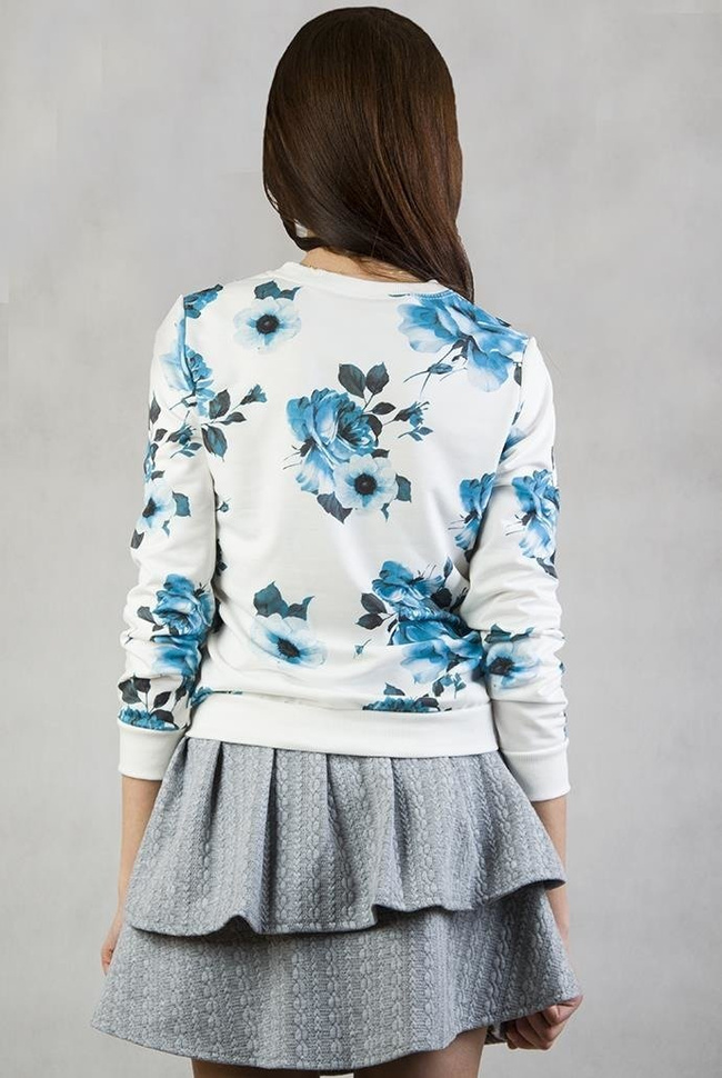 Biała bluza z niebieskimi kwiatami, ściągacz przy rękawach oraz na dole.
