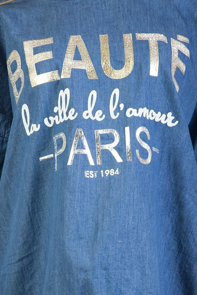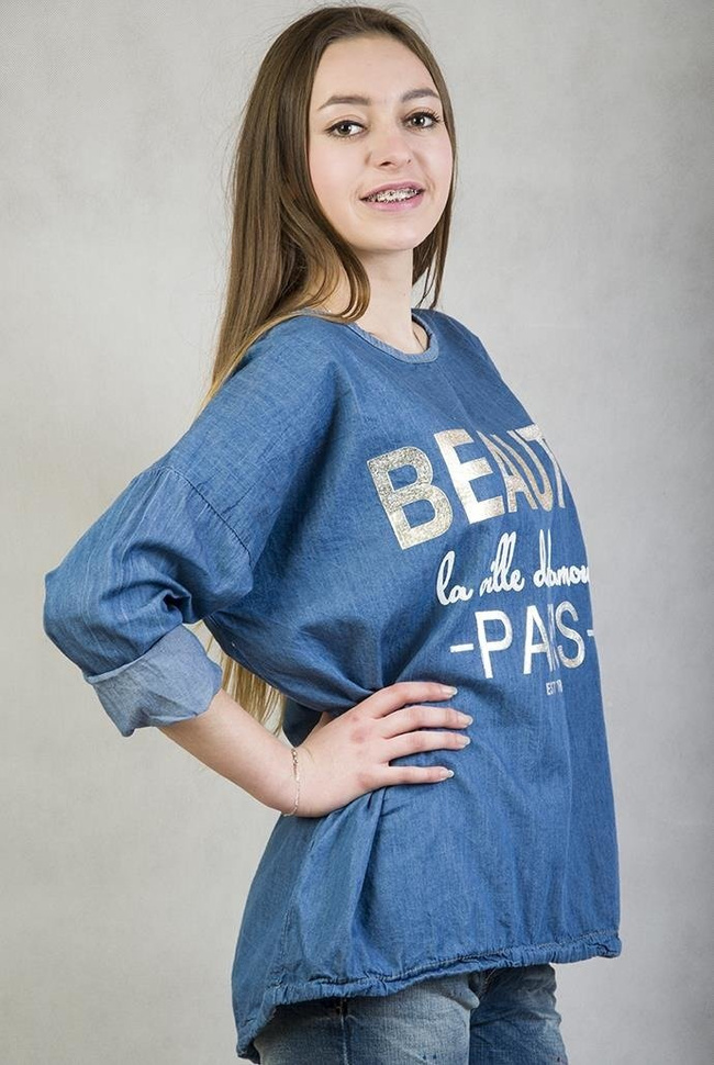 Jasno niebieska, asymetryczna bluzka jeansowa wiązana na dole z tyłu, napis z przodu " Beaute la ville de l'amour - Paris "