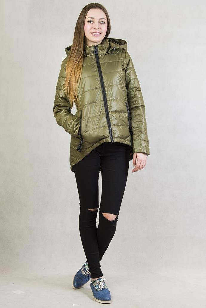 Asymetryczna szara kurtka z kapturem zapinana na zamek.
