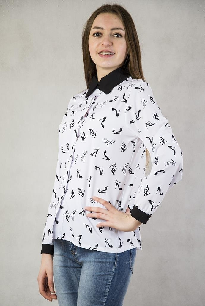 Biała koszula z czarnym kołnierzem oraz mankietami zapinana na guziki. Sztampa buty szpilki.