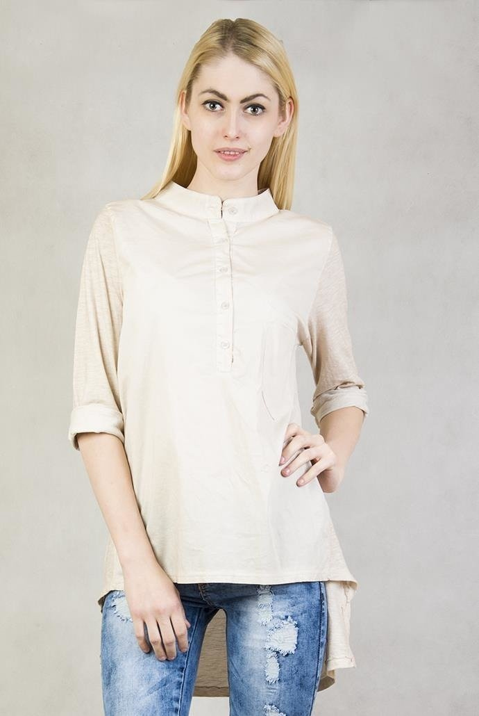 Asymetryczna, beżowa bluzka zapinana na guziki z kieszonką po boku.