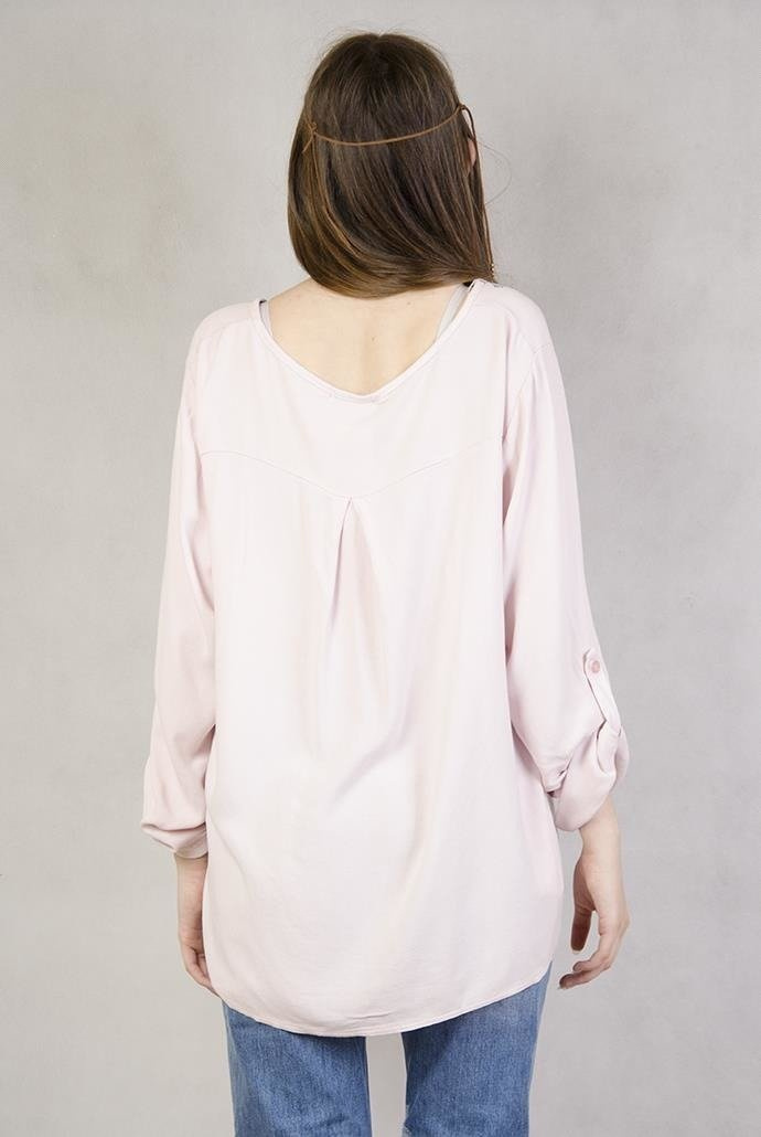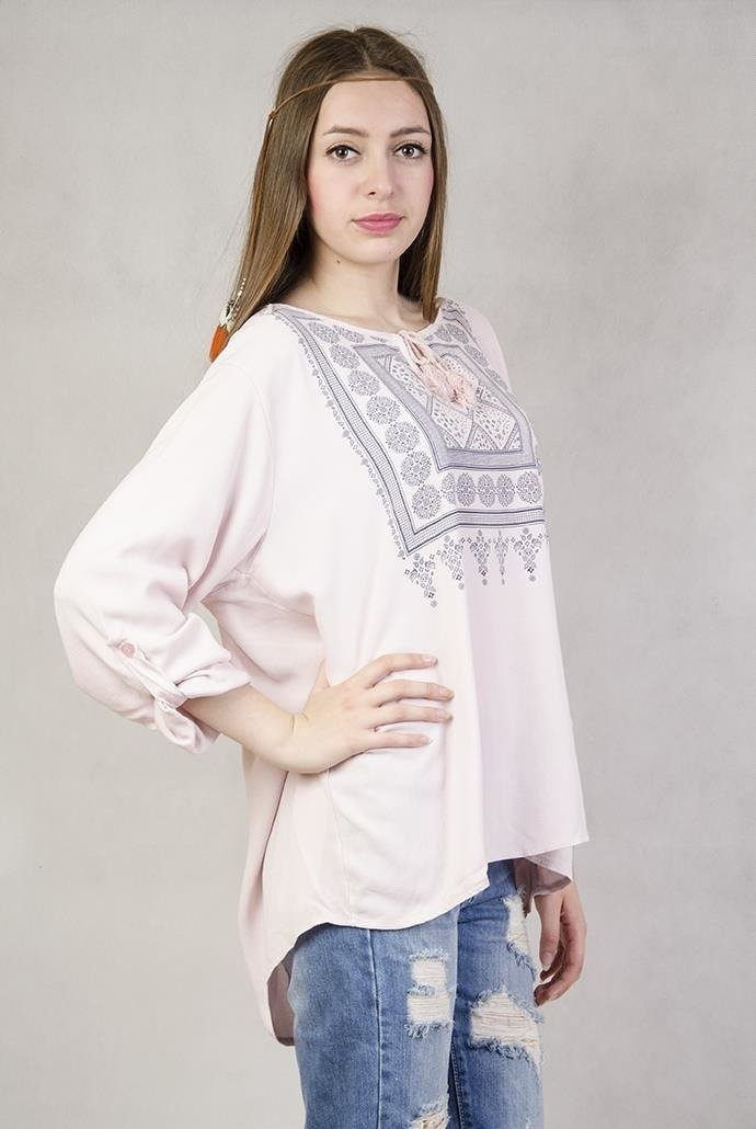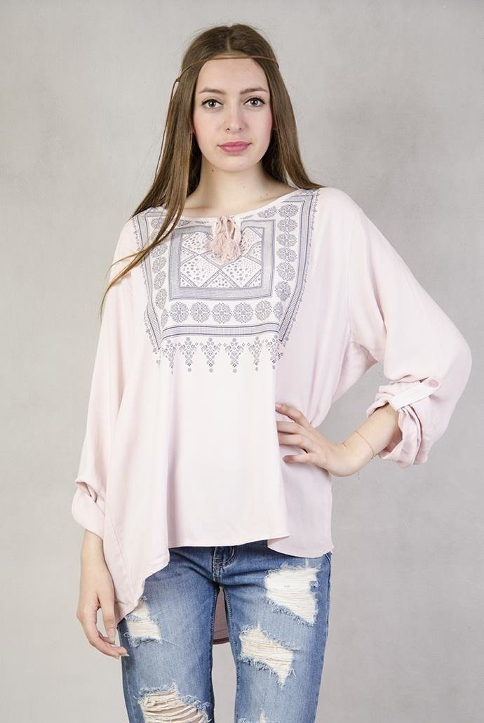 Różowa bluzka we wzorki z rękawem zapinanym na guzik oraz wiązana sznurkiem przy dekolcie.